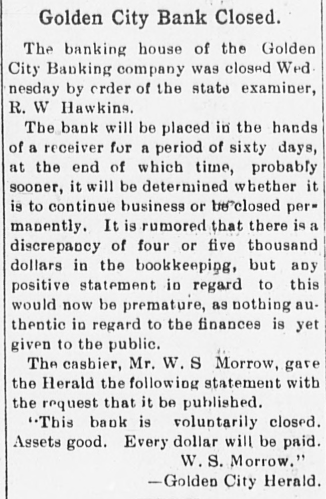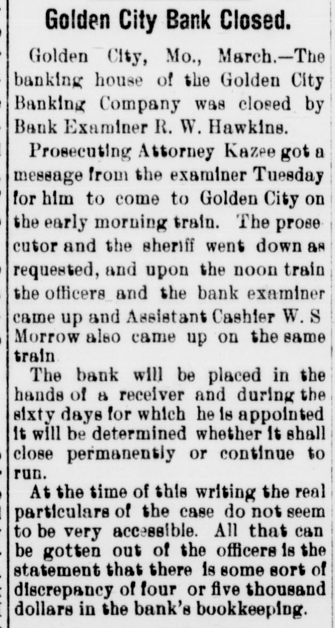 Golden City Bank Closed. Golden City, Mo., March.-The banking house of the Golden City Banking Company was closed by Bank Examiner R. W. Hawkins. Prosecuting Attorney Kazee got a message from the examiner Tuesday for him to come to Golden City on the early morning train. The prose cutor and the sheriff went down as requested, and upon the noon train the officers and the bank examiner came up and Assistant Cashier W. S Morrow also came up on the same train The bank will be placed in the hands of 8 receiver and during the sixty days for which he is appointed it will be determined whether It shall close permanently or continue to run. At the time of this writing the real particulars of the case do not seem to be very accessible. All that can be gotten out of the officers is the statement that there is some sort of discrepancy of four or five thousand dollars in the bank's bookkeeping.