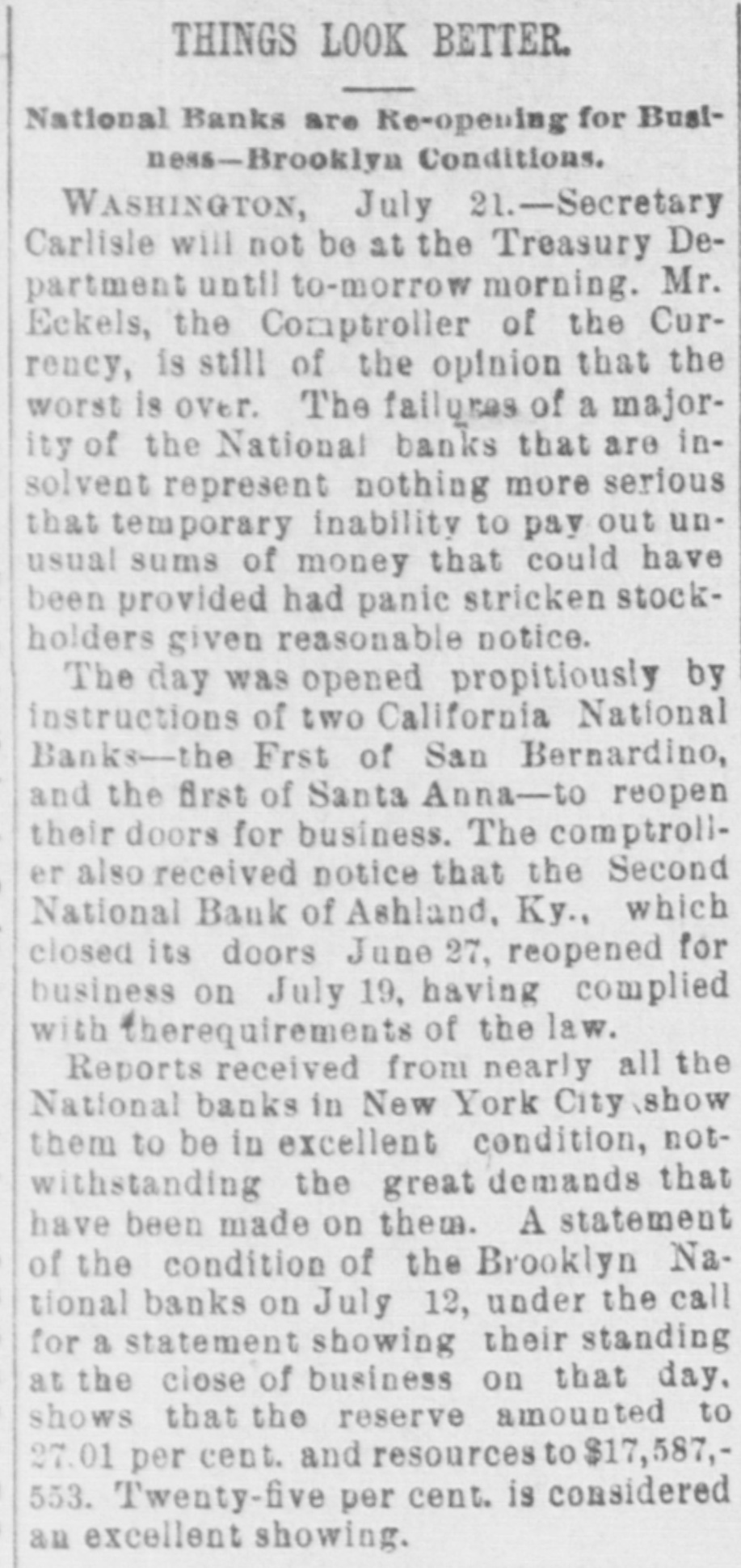 THINGS LOOK BETTER. National Banks are Re-opening for Business-Brooklyn Conditions. WASHINGTON, July 21.-Secretary Carlisle will not be at the Treasury Department until to-morrow morning. Mr. Eckels, the Comptroller of the Currency, is still of the opinion that the worst is over. The failures of a majority of the National banks that are insolvent represent nothing more serious that temporary inability to pay out unusual sums of money that could have been provided had panie stricken stockholders given reasonable notice. The day was opened propitiously by instructions of two California National Banks-the Frst of San Bernardino, and the first of Santa Anna-to reopen their doors for business. The comptrolier also received notice that the Second National Bank of Ashland, Ky., which closed its doors June 27, reopened for business on July 19, having complied with therequirements of the law. Reports received from nearly all the National banks in New York City show them to be in excellent condition, notwithstanding the great demands that have been made on them. A statement of the condition of the Brooklyn National banks on July 12, under the call for a statement showing their standing at the close of business on that day. shows that the reserve amounted to 27.01 per cent. and resources to $17,587,553. Twenty-five per cent. is considered an excellent showing.
