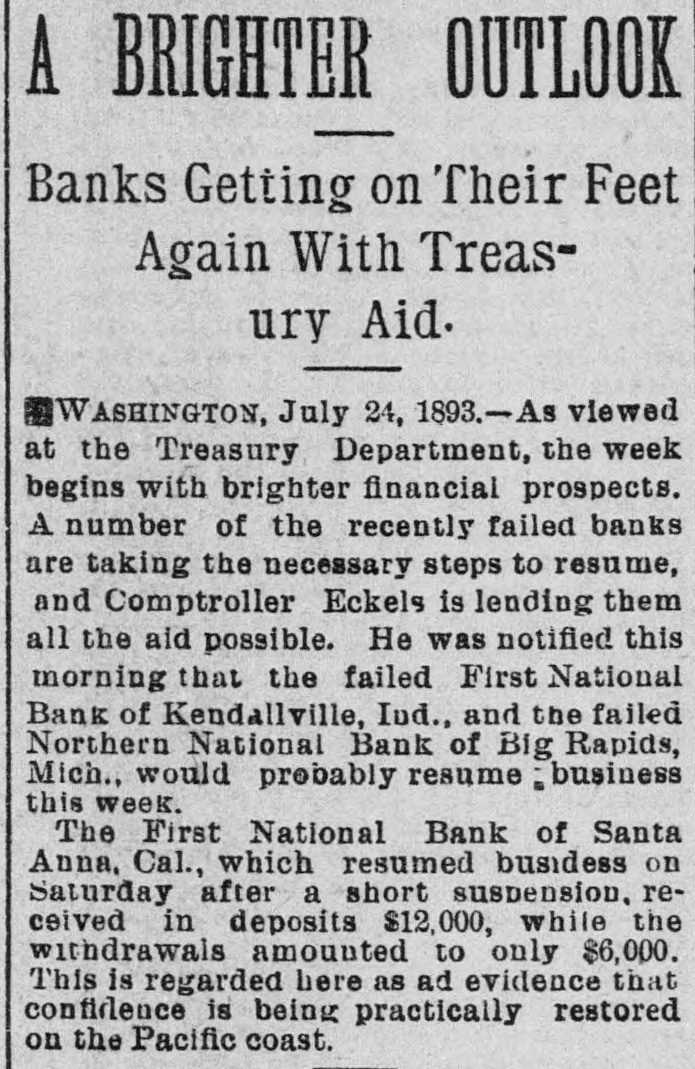 A BRIGHTER OUTLOOK Banks Getting on Their Feet Again With Treasury Aid. WASHINGTON, July 24, 1893.-As - viewed at the Treasury Department, the week begins with brighter financial prospects. A number of the recently failed banks are taking the necessary steps to resume, and Comptroller Eckels is lending them all the aid possible. He was notified this morning that the failed First National Bank of Kendallville, Ind., and the failed Northern National Bank of Big Rapids, Mich., would probably resume : business this week. The First National Bank of Santa Anna, Cal., which resumed busidess on Saturday after a short suspension, received in deposits $12,000, while the withdrawais amounted to only $6,000. This is regarded here as ad evidence that confidence is being practically restored on the Pacific coast.