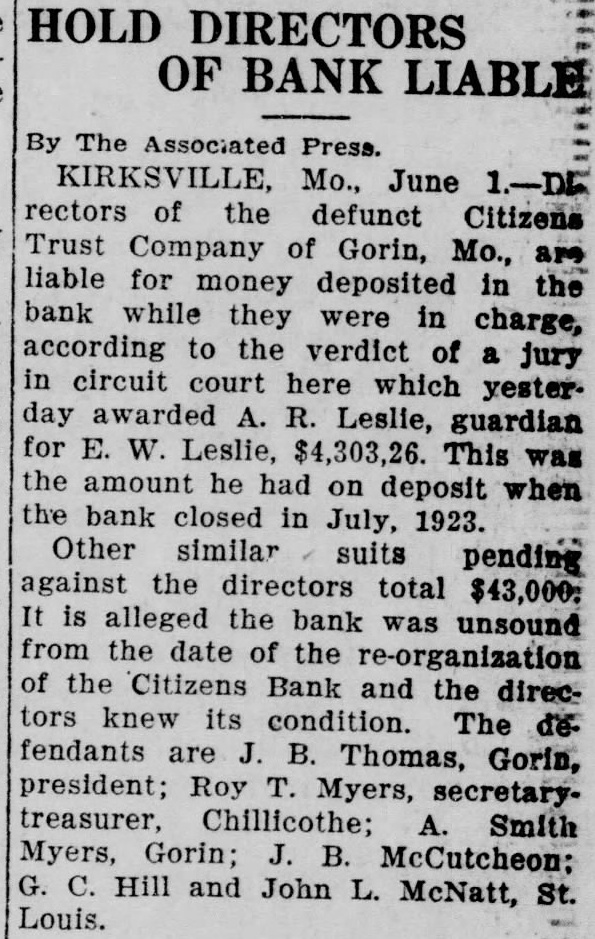 HOLD DIRECTORS OF BANK Mo., June rectors the defunct Citizens Trust Company Gorin, Mo., liable for money deposited the bank while they were in charge, according to the verdict of circuit court here which awarded R. Leslie, guardian for This the amount he had deposit when the bank closed July, 1923. Other similar pending the directors total alleged the bank was date the the Citizens Bank the tors knew its The fendants Thomas, Gorin, president; Roy Myers, Chillicothe; Smith Myers, Gorin; McCutcheon: Hill and John McNatt, Louis.