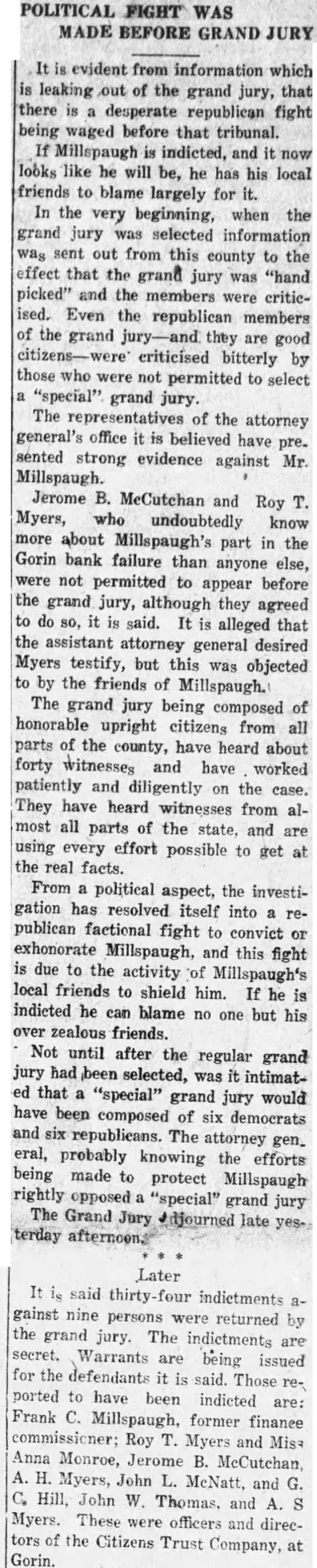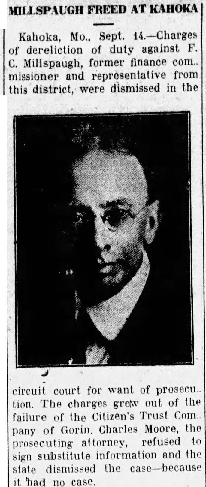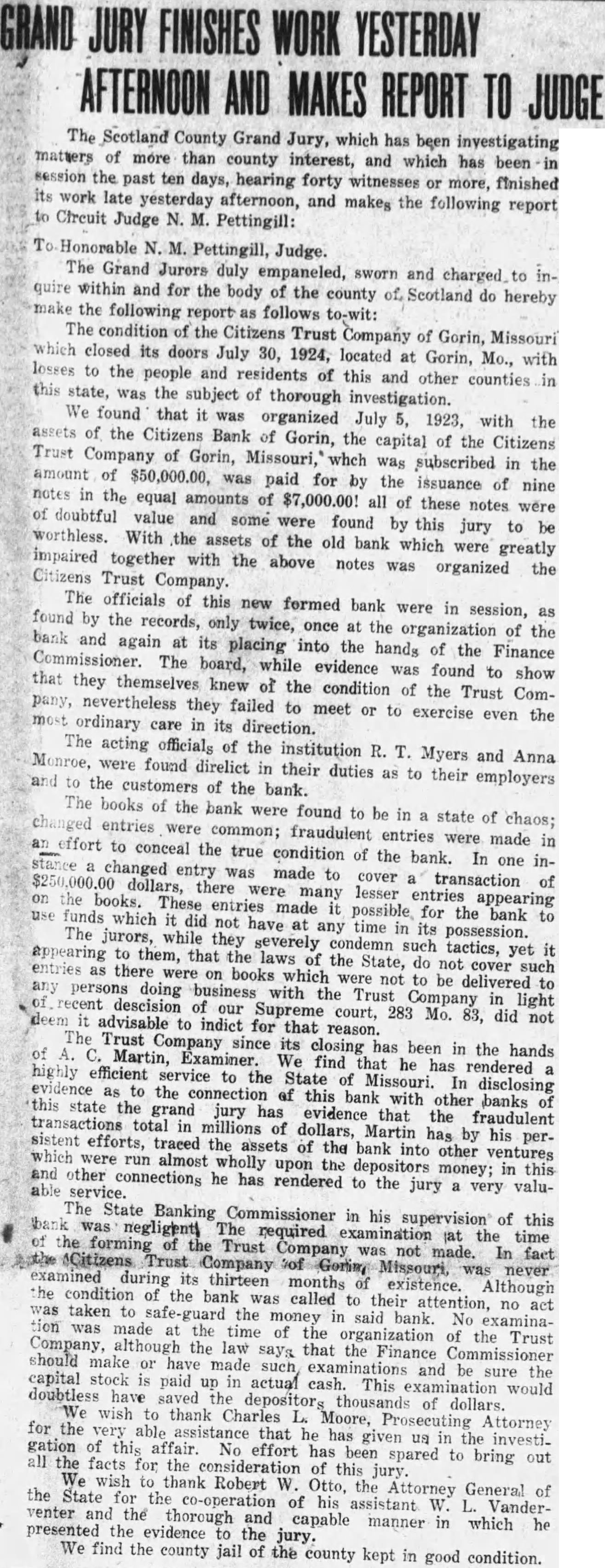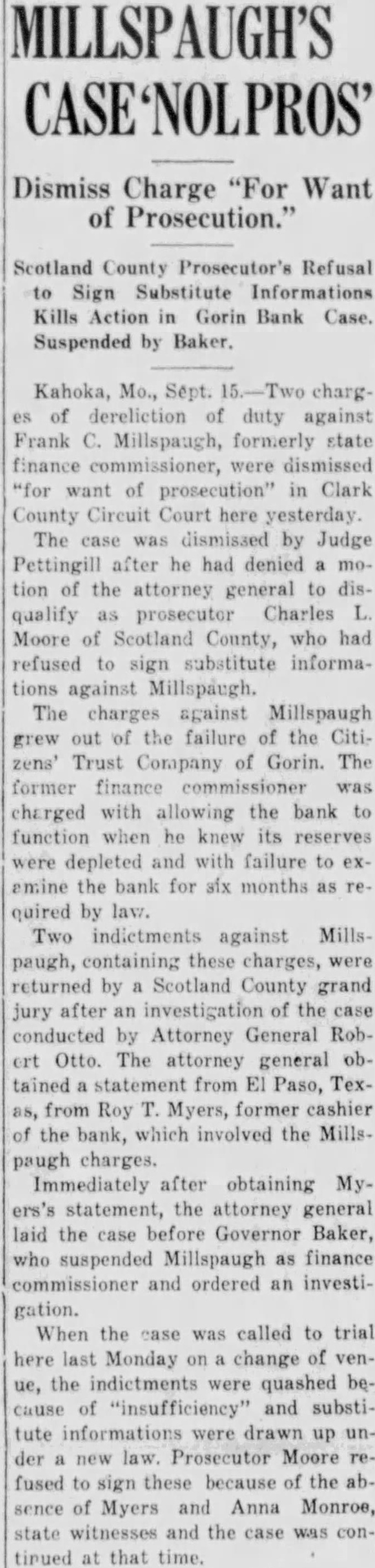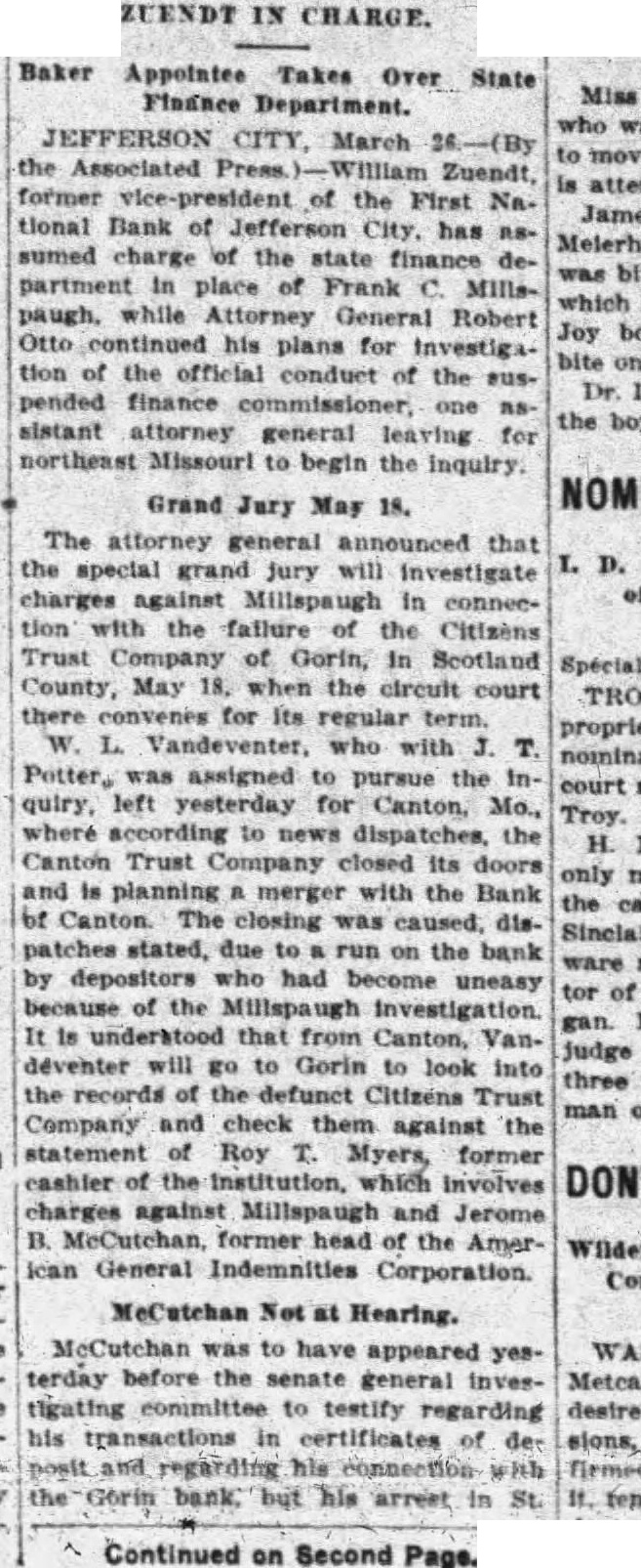 Otto Continues Plans Investigation of Official Conduct of Suspended chan's His Appearance Before Senate Probers. Associated City, March William Zuendt, former president First National Jefferson today assumed charge the state finance department place of Frank Millspaugh. while Attorney General Robert Otto continued his plans for Investigation the official conduct the suspended finance commissloner. assistant attorney general leaving for northeast Missouri inquiry. The attorney general announced today that special grand jury Investigate charges against Millspaugh connection with the the Citizens Trust Company Gorin. be called Scotland county. May when the circuit there convenes its regular term. Trust Company Closes. Potter. assigned pursue the inquiry. today for Canton. where. according to the Canton Trust Company closed its doors today and merger with Bank Canton. The closing due. disthe bank depositors had been uneasy because the investigation. understood that from Canton that will Gorin look into the records of the defunct Citizens Trust Company and check them against the statement Roy Myers. former the Institution which involves charges against Millspaugh and Jerome McCutchan. former head the American General Indemnities Corporation. McCutchan was 10 have appeared today before the senate general vestigating committee testify garding transactions in certificates deposit and regarding his connection with the Gorin bank. but arrest Louis yesterday charge of larceny of note from the trust company of Gorin precluded his appearance. Martin, special deputy finance In charge the Citizens Trust Company, under subpoena teatify before committee today. other business, understood connection with the Canton Trust Company closing, prevented his pearance. Letter Made Public. General Otto today made public letter wrote to Finance Commissioner Millspaugh March information why prosecution had not been begun Citizens and requesting the tions McCutchan with the institution. This letter was not swered, the attorney general although record telephone calls showed Millspaugh had Otto's office March when the torney out of and information that had ceived letter and would regarding when he Charles Moore. prosecuting torney Scotland county. had ference with Attorney General Otto today relative investigation: Records from the Citizens Trust Company were here by the Scotland county prosecutor inspection of attorney general. Contained the written more than fourteen pages long. of notes given the bank by McCutchan. Jefferson City, March Assistant Attorney General left late today accompany Special Deputy Finance Martin ton, where, according the Canton Trust Company closed today and planning the Bank Canton. the closing trust the had state finance department late Suspended State Finance Frank formerly stockthe Canton trust company. for going made Attorney General Robert Vandeventer the two assistant atorneys assigned by Otto to into charges against Millspaugh connection with the failure the Citizens Trust pany Gorin. Certificates Issued. Frank Page, Canton Trust Company testified sonate general committee recently that has issued (Continued