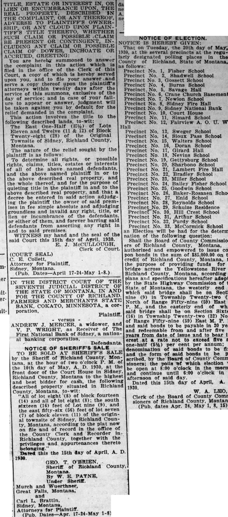 TITLE, ESTATE OR INTEREST IN, OR LIEN OR THE REAL PROPERTY, DESCRIBED $N OR ADVERSE OWNERSHIP, CLOUD PLAINTIFF'S TITLE WHETHER SUCH CLAIM OR POSSIBLE BE PRESENT OR CONTINGENT, CLUDING OR CLAIM OF DOWER, INCHOATE OR hereby to answer You the this action which is filed in the office the Clerk of this copy hereby upon file serve upon plaintiff's within twenty days after service attorneys this exclusive the day of service; and in your fail- will appear against you by default for the relief the This action Involves the title to the following described The East (E½) Lots and Twelve (11 Block Twenty (28) the Original Townsite of Sidney, Richland County, nature of the relief sought by the all rights, or possible rights, claims, titles, estates or interests the above named defendants, and the named plaintiff in or the above described real property, and the the plaintiff and to the above described real property, and that decree entered in said action adjudging the plaintiff the owner of said premIses fee simple and and any title, or lien either them, and barring defendants from asserting any right in premises. my and the seal of the said Court this 15th day April, E. Clerk of Court. (COURT SEAL) Collett, Attorney Plaintiff, Sidney, (Pub. Dates-April 17-24-May 1-8.) IN THE DISTRICT COURT OF THE OF THE STATE OF FOR THE OF FARMERS STATE BANK, COKATO, MINNESOTA, corporation, versus ANDREW MERCER, widower, and WRIGHT, Receiver The National Bank Sidney, nationFirst al banking Defendants. NOTICE OF SHERIFF'S TO BE AT SHERIFF'S SALE of Richland Monthe by the hour of two o'clock day of May, 1930, the front the Montana the highest and bidder cash, the following described property situated in Richland County, of Montana, (8) of block fourteen (14) and eight (8): sixteen (16) feet nine the (56) feet lot seven block (11) the origintownsite of Sidney, Richland County, Montana, according to the file the office and and Recorder Richland together the privileges and thereto belonging Dated this the 15th day of April, A. D. 1930. Sheriff of Richland County, Montana By W. PAYNE. Under Murch and Wuerthner, Great Falls, Montana, Carl Montana for Plaintiff 1-8) (Pub. NOTICE OF ELECTION. NOTICE IS HEREBY GIVEN: That Tuesday, the 20th day of May, the the regularly the County of Richland, of Montana, follows: No. Fisher School Precinct No. Shadwell School Precinct No. Gossett School Precinct Burns School Precinct Savage Hall Crane Church Basement Newlon School Precinct No. Sidney Fire Hall Precinct Sidney Bank Precinct No. Court Precinct Simard Precinct No. 12, Fairview A. O. U. W. Hall Sweger School Precinct Sioux School Precinct Walters School Precinct Doran School Precinet Girard Hall Precinct Nevins School Precinct School Precinct Sharbono School Precinct Lambert Fire Hall Precinct Bradley School Precinct Miller School Bailey Fisher School Goodwin School Precinct Precinct Enid School Precinct Reynolds School Precinct Schulze Residence Precinct School Precinct School Precinct Purdy Precinct School Election will be had for the determ nation the question: Shall the Board of Commission County, Montana, uthorized to issue pon bonds the on credit of County, Montana, the purpose of providing funds for bridge River Richland Montana, plans specifications hereafter the State Highway Commission State of the westerly end which bridge on North (59) East the easterly end of whi bridge be Section Sixte in (22) of Range (59) said bonds redeemable five years from date of issue bear erest rate not to exceed five annum; said bonds be and the bonds scribed, County sioners; the polls of which election open 8:00 o'clock the and continue o'clock in afternoon Dated this 15th day of April, 1930. LEO, Clerk of the Board of County Comm sioners (Pub. dates Apr. 24, May 15)