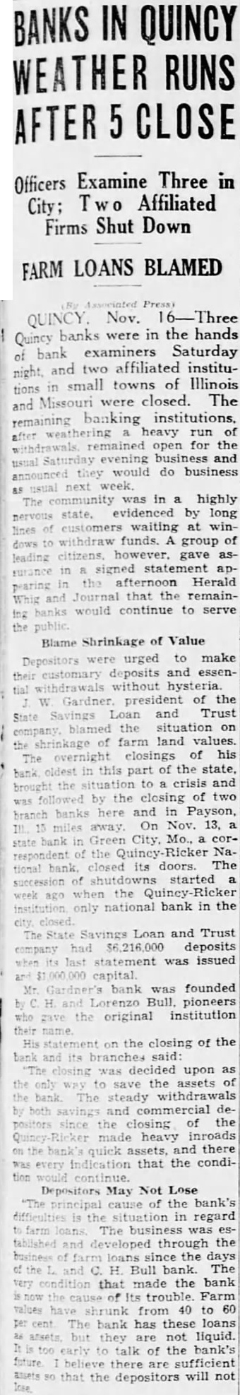 The State Savings Loan and Trust Company of Quincy closed last Saturday and smaller banks in Missouri and Illinois suffered because of their business relations with the banks that had suspended active business. Quincy, III., Nov. Quincy banks were in the hands of bank examiners tonight; two affiliated institutions in small towns of Illinois and Missouri were closed. and the remaining banking institutions of this city, after weathering a heavy run of withdrawals, remained open for the usual Saturday evening business and announced they would do business as usual next week. J. W. Gardner, president of the State Savings Loan and Trust Company, blamed the situation on the shrinkage of farm land values. The overnight closing of his bank, oldest in this part of the state, brought the situation to crisis and was followed by the closing of two branch banks here and in Payson, III., 15 miles away. On Nov. 13, a state bank in Green City, Mo., correspondent of the National Bank, closed its doors. The succession of shutdowns started week ago when the institution, only national bank in the city, closed. The State Savings Loan and Trust Company had $6,216,000 deposits when its last statement was issued, and capital. The South Side State Savings Bank and the Payson State Savings Bank at Payson, branches, closed during the morning. Mr. Gardner's bank was founded by C. H. and Lorenzo Bull, pioneers who gave the original institution their name. His statement on the closing of the bank and its branches said: "The closing was decided upon as the only way to save the assets of the bank. The steady withdrawals by both savings and commercial depositors since the closing of the Quincy Ricker made heavy inroads on the bank's quick assets, and there was every indication that the condition would continue. The principal cause of the bank's difficulties is the situation in regard to farm loans. The business was established and developed through the business of farm loans since the days of the L. & H. Bull Bank. The very condition that made the bank is now the cause of its trouble. Farm values have shrunk from 40 to 60 per cent. The bank has these loans assets. but not liquid. It too early too talk of the bank's future. believe there are sufficient assets so that the depositors will not lose."