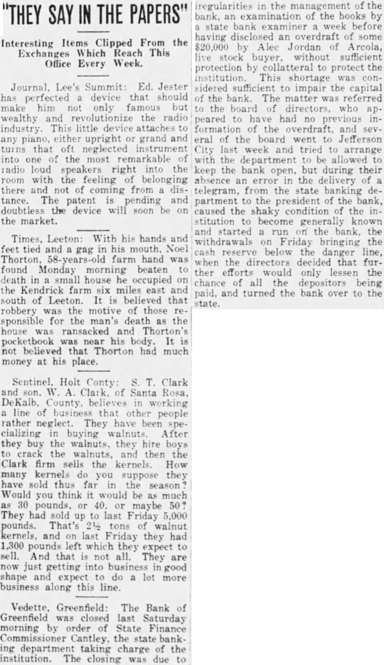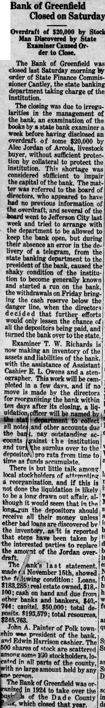 Bank of Greenfield Closed on Saturday Overdraft of $20,000 by Stock Man Discovered by State Examiner Caused der to Close. The Bank of Greenfield was closed last Saturday morning order of State Finance Commissioner Cantley, the state banking department taking charge of the institution. The closing was due to irregularities in the of management the bank, an examination of the books by state bank examiner week before having disclosed an overdraft of some by Alec Jordan of Arcola, livestock buyer, without sufficient protection by collateral to protect the institution. This shortage was considered sufficient to impair capital of the bank. The matter was referred to the board of directors. who appeared to have had no previous information of the overdraft, and several of the board went to Jefferson City last week and tried to arrange with the department to be allowed to keep the bank open, but during their absence an error in the livery of a telegram, from the state banking department to the president of the bank, caused the shaky condition of the institution to become generally known and started run on the bank, the withdrawals Friday bringthe cash reserve below the danger line, when the directors that further efforts would only lessen the chance of all the depositors being paid, and turned the bank to the state, Examiner W. Richards is now making an inventory of the assets and liabilities of the bank, with the assistance of Assistant Cashier Owens and stenographer. will be completed in few days, and if no move is made bv the directors for reorganizing the bank within ten days after its closing, liqwill be named to collect and other accounts due the ban pay outstanding counts gainst institution and surplus the over to depositor rata from time to time as funds accumulate. There is but little talk among local of and if this is not done the in liquidation is likely to be long drawn out affair, though it would that in the seem the depositors should receive all their money unless other bad loans discovered bv the inventory, is reported that steps have been taken by the interested parties to replace the amount of the Jordan overdraft. 15th, showed the condition: Loans, $18,cash on hand and from due other banks and bankers, $40,744: capital. total deposits. total resources, John Painter of Polk town president of the bank, and Edwin Harrison cashier. The shares of stock are scattered in all parts of the county, no held by any person. The Bank of Greenfield was in 1924 to take over the of the County ing which closed that year.