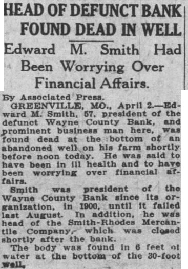 HEAD OF DEFUNCT BANK FOUND DEAD IN WELL Edward M. Smith Had Been Worrying Over Financial Affairs. By Associated Press. GREENVILLE, MO., April 2.-Edward M. Smith, 57. president of the defunct Wayne County Bank, and prominent man here, was found dead at the bottom of an abandoned on his farm shortly before noon today. He was said to have been in 111 health and to have been worrying over financial af. fairs. Smith was president of the Wayne County Bank since Its or ganization, in 1900, until It failed last August. In addition, he was head of the Smith Rhodes Mercantile Company, which was closed shortly after the bank. The body found in 6 feet of water at the bottom of the 30-foot