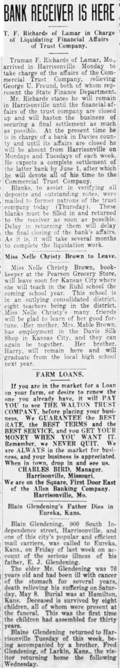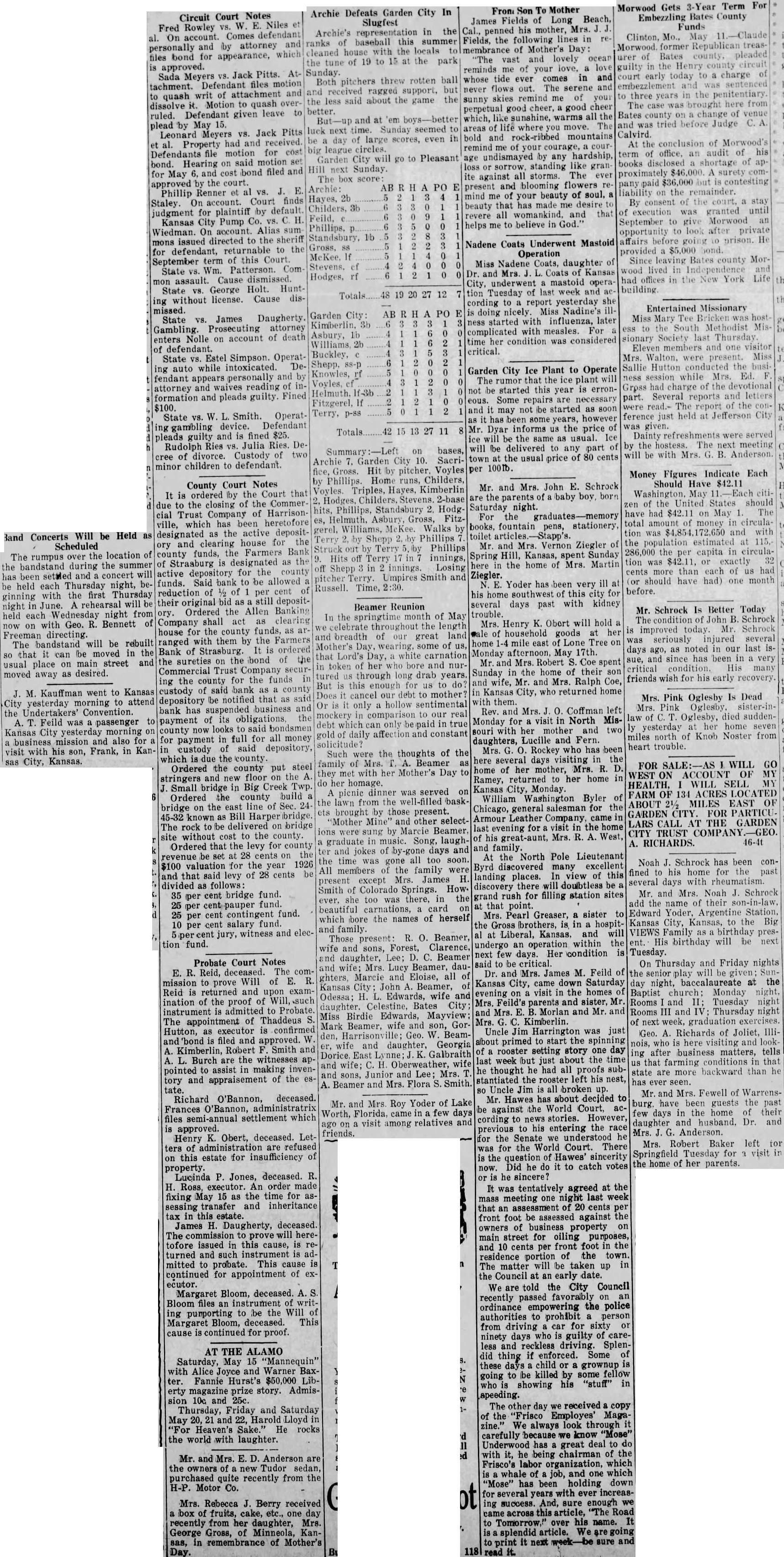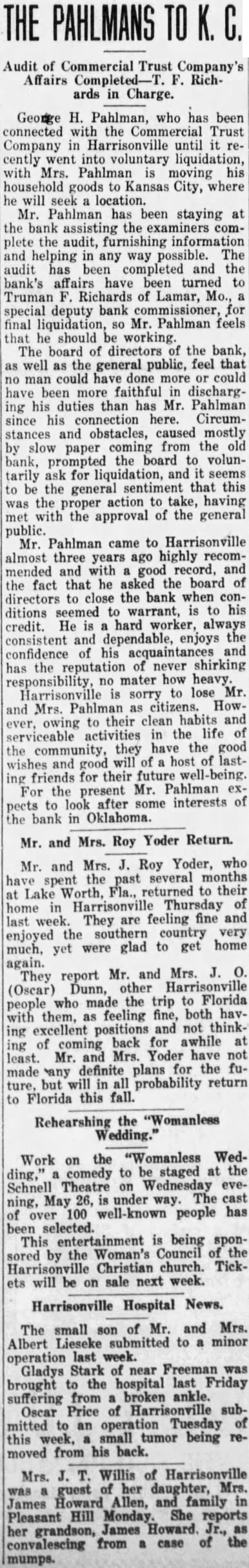 Mr. and Mrs. John Schrock the of baby boy, born parents Saturday night. For the books, fountain pens, stationery, tion toilet and Mrs. Vernon Ziegler of Mr. Hill, Kansas, spent Sunday Spring Martin tion here the home of Mrs. Ziegler. Yoder has very ill his home of this city for several days past with kidney Mrs. Henry K. Obert will hold is of household goods her home mile east of Lone Tree on Monday afternoon. May 17th. and Mrs. Robert Coe spent Sunday the home of their son and Mr. and Mrs. Ralph Coe, in Kansas City, who returned home them. Coffman left Rev. and law for visit in North MisMonday souri her mother and two daughters, Lucille and Fern. Mrs. Rockey who has been here several days visiting in the home of her mother, Mrs. R. returned to her home in Ramey, Kansas City, Monday. William Washington Byler of general salesman for the Chicago, Armour Leather Company, came in for visit in the home last evening of his Mrs. West, and family. At the North Pole Lieutenant discovered excellent many In view of this landing places. discovery there will doubtless be rush for filling station sites grand at that point. Mrs. Pearl Greaser, sister to the Gross brothers, is in Liberal, Kansas. and will al at within the undergo an operation few days. Her condition is next said to be critical. and Mrs. James M. Feild of Dr. Kansas City, came down Saturday visit in the homes evening on Feild's parents and sister, and Mrs. Morlan and Mr. and G. Kimberlin. Uncle Jim Harrington was just albout primed start the spinning rooster setting story one day but about the time week just he had all proofs subhe thought stantiated the rooster left his nest, 80 Uncle Jim all broken Mr. Hawes has about decided to be against the World acnews stories. However, cording to his entering the race previous for the Senate we understood he for the World Court. There the question of Hawes' sincerity Did he do it to catch votes now. is he sincere? tentatively agreed at the mass meeting one night last week that an of 20 cents per front foot be assessed against the owners of business property on main street for oiling purposes, and 10 cents per front foot in the residence portion of the town. The matter will be taken up in the Council at an early date. are told the City Council recently passed favorably on ordinance empowering the police authorities to prohibit person from driving car for sixty or ninety days who is guilty of careless and reckless driving. Splenif enforced. Some of did thing these days child or grownup is be killed some fellow going to by his "stuff" in who showing speeding. The other day received copy of the "Frisco Employes' MagaWe always look through carefully because know has great deal with it, he being chairman of the Frisco's labor organization, which whale of and one which job, "Mose" has been holding down for several years with increasing success. And, sure enough article, Road to over his name. It splendid article. it next sure and print read