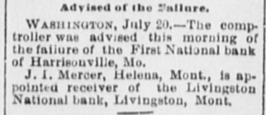 Advised of the Sallare. WASHINGTON, July 20.-The comptroller was advised this morning of the failure of the First National bank of Harrisonville, Mo. J. I. Mercer, Helena, Mont., is appointed receiver of the Livingston National bank, Livingston, Mont.