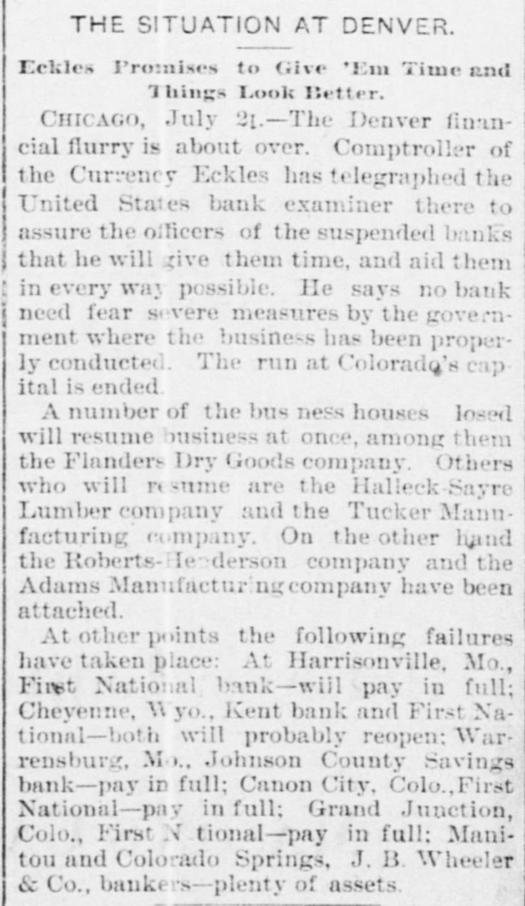 banking institutions generally. as follows: Frank Adams, National Bank Examiner. Danver, Co4: I wish you would announce to the officers of the banks which have falled in Denver that it is my intention to lend them every aid possible looking towards speedy resumption on their part, and that I shall grant to them suncient time to enable them to not only collect in such amounts as are speedily collectible, but to get together such amounts of money as will enable them to open upon & BOLK basis. It seems to me that such citizens as have. by a foolish course of conduct in withdrawing doposits from banks which BO long enjoyed their complete confidence, brought about this condition. ought, in view of the damage they have done their city, as early as possible try to repair it by standing ready to deposit with them. I tuily appreciate all the circumstances of the situation and the unnecessary loss entailed. You are authorized to employ as assistants. to protect paper and collect in moneys, the most competent and trustworthy employes in such institutions. I have also ordered Examiner McHugh of Iowa to report at once to assist you. I desire that this telegram be given to the press at Denver, evidencing as it does that,the comptroller has faith in the ability of the banks of Denver to resume, and of his desire to lend them every assistance consistent with his official duty. When asked to express more fully his views on the condition of affairs, Mr. Eckels said the failures in Denver, yesterday, like a number of other national bank failures. were caused by no fault of the bank officials, but through a foolish and uncalled for lack of confidence on the part of depositors. "It is my intention," he said, "where a bank has been properly conducted and whose assets under ordinary circumstances would have permitted it to remain solvent, to give the institution every opportunity to resume business. All the Denver banks that failed were well conducted and every opportunity will be given them to reopen. The people who have caused this Denver disaster by foolish runs should do all they can to help the banks resume." TWO MORE FAILURES. Notifications of two more failures reached Mr. Eckles this forenoon. The unfortunate banks are the First National Bank of Harrisonville, Mo., which went under this morning, and the Oklahoma National Bank of Oklahoma City, Oklahoma, which closed its doors yesterday.