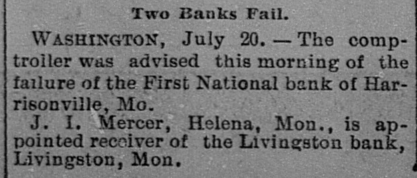 Missouri Bank Closed. WASHINGTON, July 20.-The comptroller was advised this morning of the failure of the First National bank of Harrisonville, Mo. J. I. Mercer of Helena, Mont., has been appointed receiver of the Livingston National bank at Livingston. Mont.