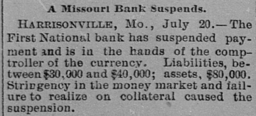 A Missouri Bank Suspends. HARRISONVILLE, Mo., July 20.-The First National bank has suspended payment and is in the hands of the comptroller of the currency. Liabilities, between $30,000 and $40,000; assets, $80,000. Stringency in the money market and failure to realize on collateral caused the suspension.