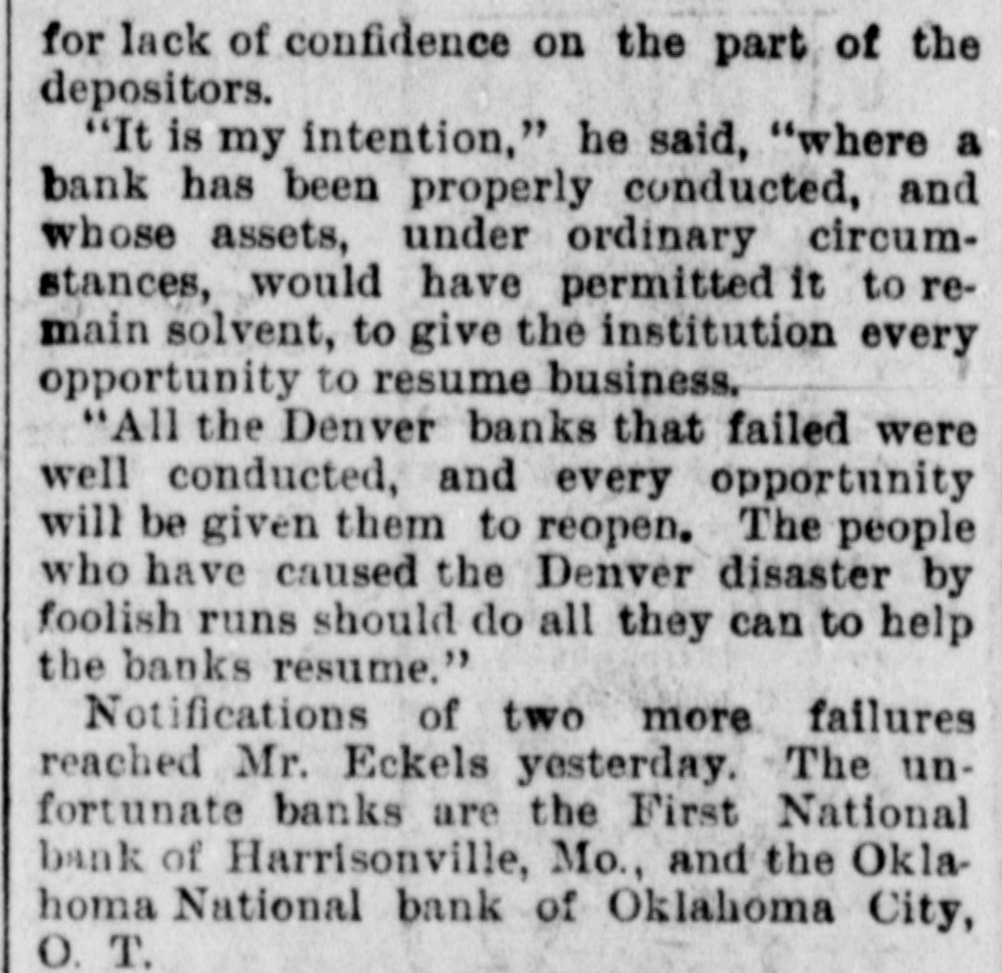for lack of confidence on the part of the depositors. "It is my intention," he said, "where a bank has been properly conducted, and whose assets, under ordinary circumstances, would have permitted it to remain solvent, to give the institution every opportunity to resume business. "All the Denver banks that failed were well conducted, and every opportunity will be given them to reopen. The people who have caused the Denver disaster by foolish runs should do all they can to help the banks resume." Notifications of two more failures reached Mr. Eckels yesterday. The unfortunate banks are the First National bank of Harrisonville, Mo., and the Oklahoma National bank of Oklahoma City, O. T.