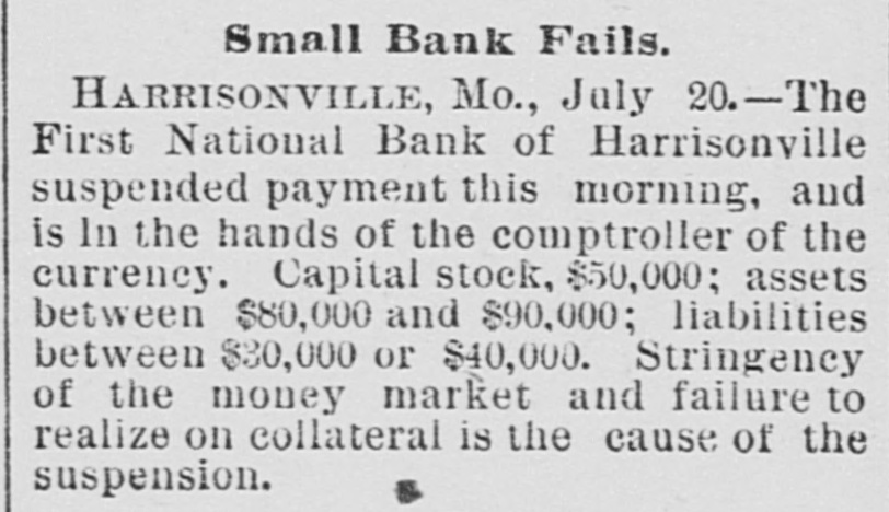 Small Bank Fails. HARRISONVILLE, Mo., July 20.-The First National Bank of Harrisonville suspended payment this morning, and is In the hands of the comptroller of the currency. Capital stock, $50,000; assets between $80,000 and $90,000; liabilities between $30,000 or $40,000. Stringency of the money market and failure to realize on collateral is the cause of the suspension.