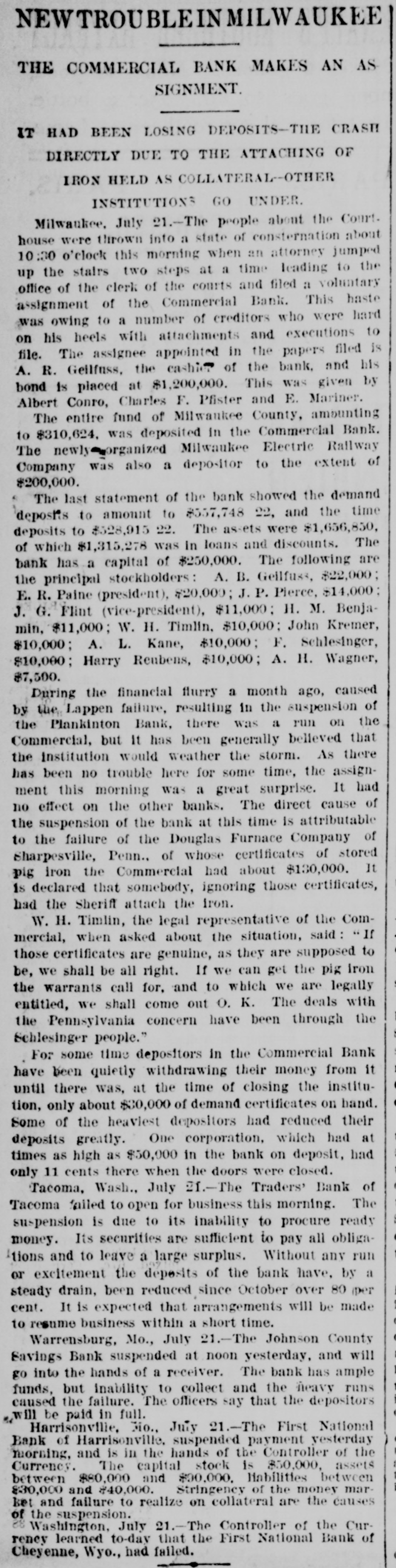 NEWTROUBLEIN MILWAUKEE THE COMMERCIAL BANK MAKES AN AS SIGNMENT. IT HAD BEEN LOSING DEPOSITS-THE CRASH DIRECTLY DUE TO THE ATTACHING OF IRON HELD AS COLLATERAL--OTHER INSTITUTIONS GO UNDER. Milwaukee, July 21.-The people about the Court. house were thrown into a state of consternation about 10:30 o'clock this morning when an attorney jumped up the stairs two steps at a time leading to the office of the clerk of the courts and filed a voluntary assignment of the Commercial Bank. This haste was owing to a number of creditors who were hard on his heels with attachments and executions to file. The assignee appointed in the papers filed is A. R. Gellfuss, the cashier of the bank, and his bond is placed at $1,200,000. This was given by Albert Conro, Charles F. Pfister and E. Mariner. The entire fund of Milwaukee County, amounting to $310,624. was deposited in the Commercial Bank. The newly organized Milwaukee Electric Railway Company was also a depositor to the extent of $200,000. The last statement of the bank showed the demand deposits to amount to $557,748 22, and the time deposits to $528,915 22. The assets were $1,656,850, of which $1,315,278 was in loans and discounts. The bank has a capital of $250,000. The following are the principal stockholders: A. B. Gellfuss, $22,000; E. R. Paine (president), $20,000; J. P. Pierce, $14,000; J. G. Flint (vice-president), $11,000; H. M. Benjamin, $11,000; W. H. Timlin, $10,000; John Kremer, $10,000; A. L. Kane, $10,000; F. Schlesinger, $10,000; Harry Reubens, $10,000; A. H. Wagner, $7,500. During the financial flurry a month ago, caused by the Lappen failure, resulting in the suspension of the Plankinton Bank, there was a run on the Commercial, but It has been generally believed that the Institution would weather the storm. As there has been no trouble here for some time, the assignment this morning was a great surprise. It had no effect on the other banks. The direct cause of the suspension of the bank at this time is attributable to the failure of the Douglas Furnace Company of Sharpesville, Penn., of whose certificates of stored pig iron the Commercial had about $130,000. It 1s declared that somebody, ignoring those certificates, had the Sheriff attach the iron. W. H. Timlin, the legal representative of the Commercial, when asked about the situation, said If those certificates are genuine, as they are supposed to be, we shall be all right. If we can get the pig iron the warrants call for, and to which we are legally entitled, we shall come out O. K. The deals with the Pennsylvania concern have been through the Schlesinger people." For some time depositors in the Commercial Bank have been quietly withdrawing their money from it until there was, at the time of closing the institution, only about $30,000 of demand certificates on hand. Some of the heavlest depositors had reduced their deposits greatly. One corporation, which had at times as high as $50,000 in the bank on deposit, had only 11 cents there when the doors were closed. Tacoma, Wash., July 21.-The Traders' Bank of Tacoma failed to open for business this morning. The suspension is due to its inability to procure ready money. Its securities are sufficient to pay all obliga¹tions and to leave a large surplus. Without any run or excitement the deposits of the bank have, by a steady drain, been reduced since October over 80 (per cent. It is expected that arrangements will be made to resume business within a short time. . Warrensburg, Mo., July 21.-The Johnson County Savings Bank suspended at noon yesterday, and will go into the hands of a receiver. The bank has ample funds, but inability to collect and the heavy runs caused the failure. The officers say that the depositors will be paid in full. Harrisonville, Mo., July 21.-The First National Bank of Harrisonville, suspended payment yesterday morning, and is in the hands of the Controller of the Currency. The capital stock is $50,000, assets between $80,000 and $90,000. liabilities between $30,000 and $40,000. Stringency of the money market and failure to realize on collateral are the causes of the suspension. 88 Washington, July 21.-The Controller of the Currency learned to-day that the First National Bank of Cheyenne, Wyo., had failed. .
