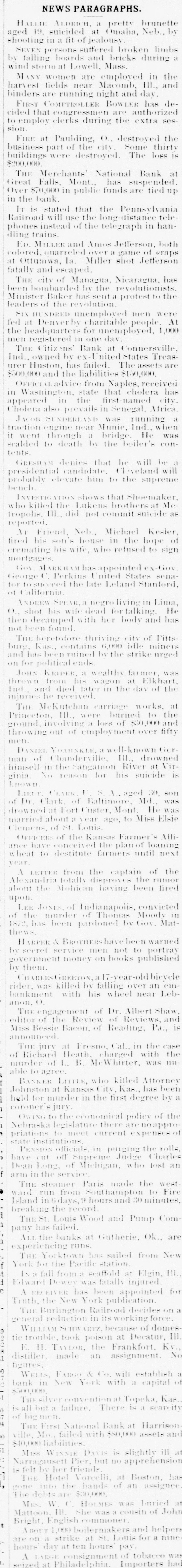 sion FIRE at Paulding, O destroyed the business part of the city Some thirty buildings were destroved The loss is $200,000. THE Merchants National Bank at Great Falls Mont. has suspended Over 870,000 in public funds are tied up in the bank. IT is stated that the Pennsylvania Railroad will use the long-distance telephonesinstead of the telegraph in hanlling trains. ED. MILLER and Amos Jefferson, both volored, quarreled over a game of eraps it Ottumwa, la. Miller shot Jefferson fatally and escaped. THE city of Managua. Nicaragua, has been bombarded by the revolutionists Minister Baker has sent a protest to the leaders of the revolution. Six HUNDRED unemployed men were fed at Denverb charitable people At the headquarters for unemployed, 1,000 men registered mone day THE Citizens' Bank at Connersville, Ind., owned by ex-United States Treasurer Huston, has failed. The assets are 500.000 and the liabilities $150,000 Officialadvie from Naples, received in Washington, state that cholera has appeared in the first-named city, holera also prevails in Senegal. Africa. a JACOB SUNDERLAND was running traction engine near Munie Ind.. when it went through a bridge He was scalded to death In the boiler's con tents GRESHAM denies that be will be a presidential candidate eyeland ill probably elevate him to the supreme bench INVESTIGATION shows that Shoemaker the killed the Lukens brothers at Me tropolis, III. did not commit suicide as reported. AT Friend Neb. Michael Kesler fired his son house in the hope of remating his wife, " the refused to sign mortgages Gov MARKH whas appointed ex-Gov George ( Perkins nited States sena for tosterced the late Leland Stanford, of California ANDREW SPEAR. negro living in Lima, 1.. shot his wife dead for talking. He then decamped with her body and has not been found THE heretofore thriving city of Pitts burg. Kas. contains 6,000 idle miners and has bee ruined by the strike urged on for political ends JoHN KRIDER a wealthy farmer was thrown from his wagon at Elkhart, Ind. and died later 111 the day of the injuries he received THE McKutchan carriage works at Princeton, III.. were burned to the ground. involving a loss of $20,000 and throwing out of employment over fifty men. DANIEL YOMINKLE well-known man of Chanderville, III.. drowned himself in the Sangation River at Virginia. No reason for his suicide is 1 nown LIEUT CLARK aged 30. son of Dr Mark of Baltimore, Md. was drowned at Fort Custer, Mont He was married about year ago, to Miss Elsie ( lemens, of St Louis OFFICERS of the Kansas Farmer's Alli ance have conceived the plan loaning wheat to destitute farmers until next year LETTER from the captain of the Alexandria totally disproves the rumor about the Mohican having been fired upon. LEE JONES of Indianapolis, convicted of the murder of Thomas Moody in 1872. has been pardoned by Gov. Mat thews. ARPER & BROTHERS hav cheen warned in secret service men not to portray government money on books published by them. CHARLES GREETON, year-old bicycle rider, was killed by falling over an embankment with his wheel near Lebanon. O THE engagement of Dr. Albert Shaw editor of the Review of Reviews, and Miss Bessie Bacon. of Reading Pa., is announced The jury at Fresno, Cal. in the case of Richard Heath. charged with the murder of L. B. MeWhirter, was unable to agree BANKER LITTLE, who killed Attorney Johnston at Kansas City Kas. has been held for murder in the first degree by a coroner's jury. Owing to the economical policy of the Nebraska legislature there are noappro priations to meet current expenses of state institutions Pessoxofficials in purging the rolls have ent off Supreme Judire Charles Dean Long. of Michigan, who lost an arm in the service THE steather Paris made the west ward run from Southampton to Fire Island in 16 days, 9 hours and 30 minutes breaking the record THIS Louis Wood and Pump Com pany has failed. ALL THE Banks at Gatherie, Ok., are experiencing runs. THE Yorktown has sailed from New York for the Pacific station Ix a fall from a scaffold at Elgin. III. Edward Dewel was fatally injured for A RECEIVER has been appointed Truth, the New York publication. THE Burlington Railroad decides on general reduction in its working force WILLIAM SCHW ARTZ because of domes tie trouble took poison at Decatur. III E. 11. TAYLOR, the Frankfort. Kv. distiller. made an assignment No figures. WELLS FARGO will establish bank in New York with a capital o Sweet Thesilves convention at Topeka, Kas is all but a failure. There is a scarcity of bigment THE First National Bank at Harrisot ville. Mo.. failed with $80,000 assets au $40,000 liabilities Miss WINNIE DAVIS is slightly ill Narragutsett Pier. but no apprehension is felt by her friends THE Hotel Vorcelli, at Boston has into the hands of an assignee The debts are $20,000 MRS W. HOLMES was buried a Mattoon III She was consin of John Bright English commoner. \ BOUT 1.00 boilermakers and helpers are off a strike at St. Louis for a nine