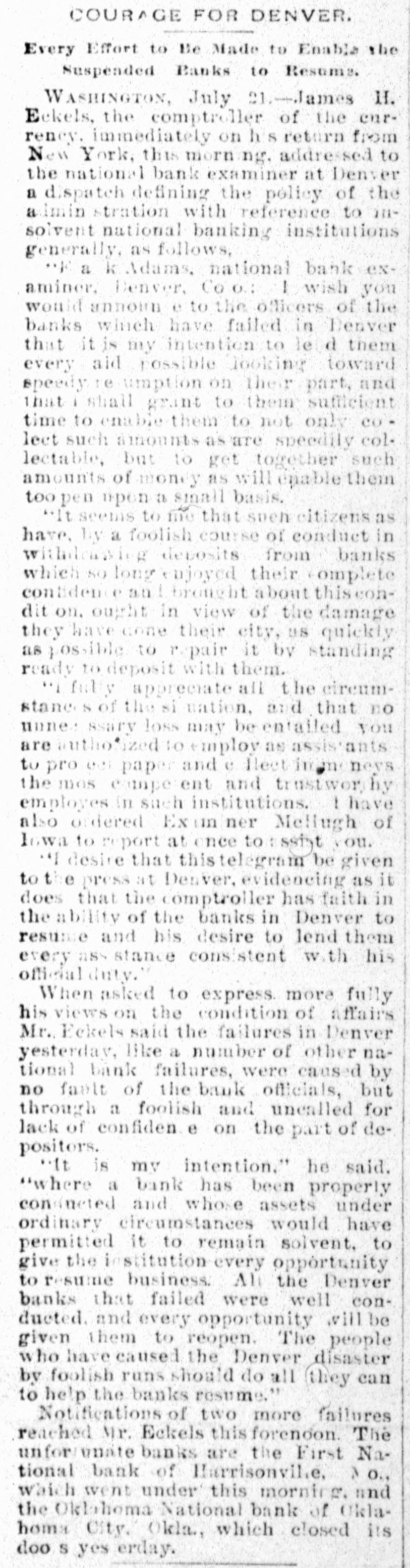 COURAGE FOR DENVER. Every Effort to Be Made to Enable the Suspended Banks to Resums. WASHINGTON, July 21.-James H. Eckels, the comptroller of the eurrency. immediately on his return from New York, this morn ng. addressed to the national bank examiner at Denver a dispatch defining the policy of the admin stration with reference to 111solvent national banking institutions generally, as follows, ** a k Adams, national bank examiner. Denver, Co O.: I wish you would annown e to the officers of the banks which have failed in Benver that it is my intention to le d them every aid possible looking toward speedy re umption on their part, and that shall grant to them sufficient time to enable them to not only colect such amounts as are speedily collectable, but to get together such amounts of money as will enable them too pen upon a small basis. "it seems to me that such citizens as have. by a foolish course of conduct in withd deposits from banks which SO long enjoyed their complete contiden an brought about thiseondit on. ought in view of the damage they have cone their city, US quickly as possible to repair it by standing ready to deposit with them. **1 fully appreciate all the circumstane of the si nation, and that no unne ssary loss may be entailed you are author ized to employ as assistants to pro 001 paper and e Elect injm: neys the mos compe ent and trustwor by employes in such institutions. I have also ordered Ex un ner Mellugh of Iowa to report at once to ssint you. *I desire that this telegram be given to e press at Denver, evidencing as it does that the comptroller has faith in the ability of the banks in Denver to resume and his desire to lend them every ass stance consistent with his official duty." When asked to express. more fully his views on the condition of affairs Mr. Eekels said the failures in Denver yesterday, like a number of other national bank failures, were caused by no fault of the bank officials, but through a foolish and uncalled for lack of confiden e on the part of depositors. "It is my intention." he said. "where a bank has been properly consucted and whose assets under ordinary circumstances would have permitted it to remain solvent, to give the institution every opportunity to resume business. All the Denver banks that failed were well conducted. and every opportunity will be given them to reopen. The people who have caused the Denver disaster by foolish runs should do all they can to help the banks resume." Notifications of two more failures reached Mr. Eckels this forenoon. The unfor unate banks are the First National bank of Harrisonvil.e. NO., which went under' this morning. and the Oklahoma National bank of Oklahoma City, Okla,, which closed its den e you erdar