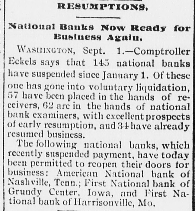 RESUMPTIONS, National Banks Now Ready for Business Again. WASHINGTON, Sept. 1.-Comptroller Eckels says that 145 national banks have suspended since January 1. Of these one has gone into voluntary liquidation, 57 have been placed in the hands of receivers, 62 are in the hands of national bank examiners, with excellent prospects of early resumption, and 34 have already resumed business. The following national banks, which recently suspended payment, have today been permitted to reopen their doors for business: American National bank of Nashville, Tenn.; First National bank of Grundy Center, Iowa, and First National bank of Harrisonville, Mo.