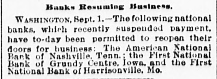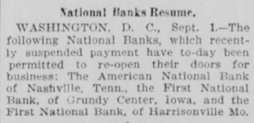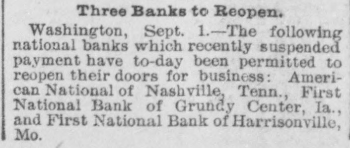 National Banks Resume. WASHINGTON, D. C., Sept. 1.-The following National Banks, which recently suspended payment have to-day been permitted to re-open their doors for business: The American National Bank of Nashville, Tenn., the First National Bank, of Grundy Center, Iowa, and the First National Bank, of Harrisonville Mo.