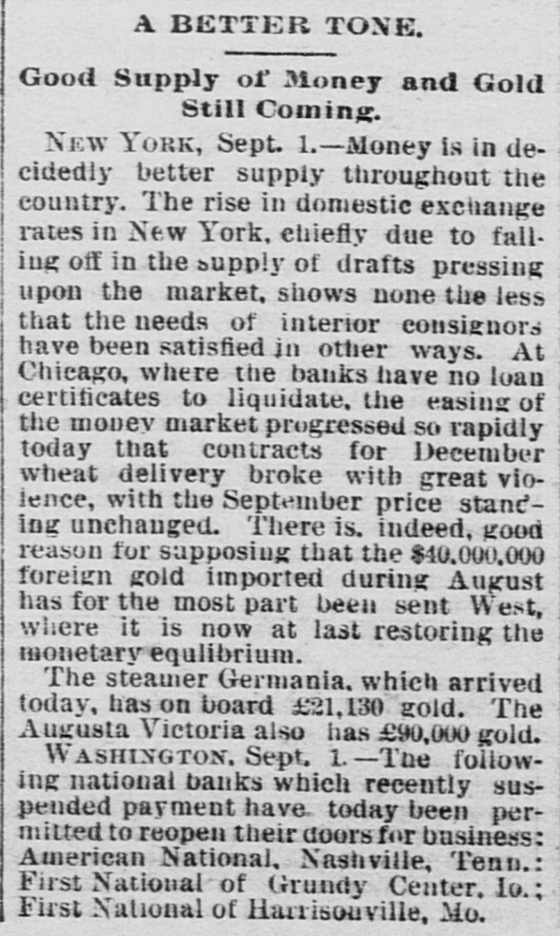 A BETTER TONE. Good Supply of Money and Gold Still Coming. NEW YORK, Sept. 1.-Money is in decidedly better supply throughout the country. The rise in domestic exchange rates in New York, chiefly due to falling off in the supply of drafts pressing upon the market, shows none the less that the needs of interior consignors have been satisfied in other ways. At Chicago, where the banks have no loan certificates to liquidate, the easing of the money market progressed SO rapidly today that contracts for December wheat delivery broke with great violence, with the September price standing unchanged. There is. indeed, good reason for supposing that the $40,000,000 foreign gold imported during August has for the most part been sent West, where it is now at last restoring the monetary equlibrium. The steamer Germania, which arrived today, has on board £21,130 gold. The Augusta Victoria also has £90,000 gold. WASHINGTON. Sept. 1.-The following national banks which recently suspended payment have today been permitted to reopen their doors for business: American National, Nashville, Tenn.: First National of Grundy Center, Io.; First National of Harrisonville, Mo.