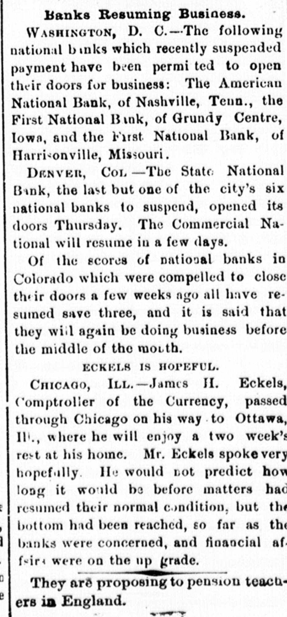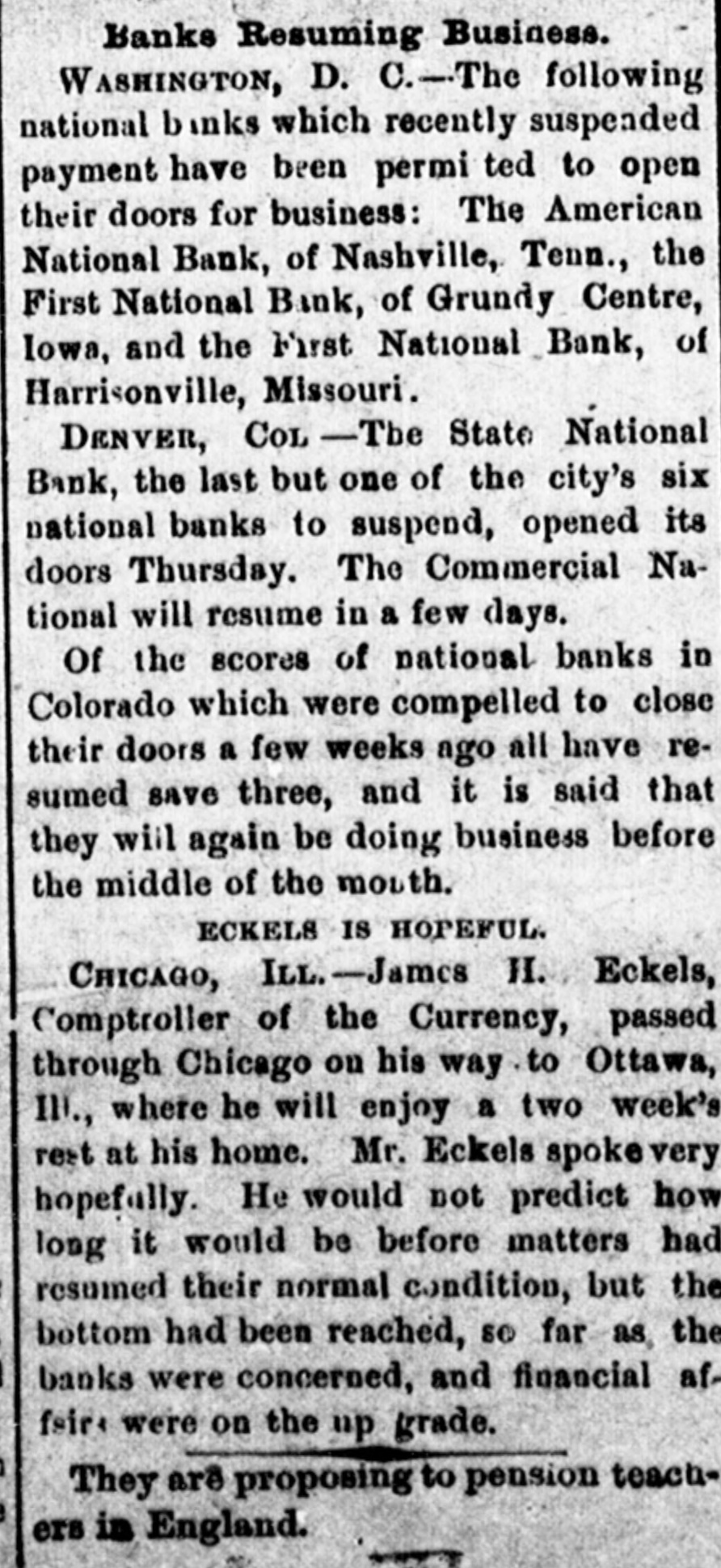 Banks Resuming Business. W ASHINGTON, D. C.-The following national binks which recently suspended payment have been permi ted to open their doors for business: The American National Bank, of Nashville, Tenn., the First National Bank, of Grundy Centre, Iowa, and the First National Bank, of Harrisonville, Missouri. DENVER, COL -The State National Bank, the last but one of the city's six national banks to suspend, opened its doors Thursday. The Commercial National will resume in a few days. Of the scores of national banks in Colorado which were compelled to close their doors a few weeks ago all have resumed save three, and it is said that they will again be doing business before the middle of the mouth. ECKELS IS HOPEFUL. CHICAGO, ILL.-James H. Eckels, Comptroller of the Currency, passed through Chicago on his way to Ottawa, III, where he will enjoy a two week's rest at his home. Mr. Eckels spoke very hopefully. He would not predict how long it would be before matters had resumed their normal condition, but the bottom had been reached, so far as the banks were concerned, and financial af fair were on the up grade. They are proposing to pension teachers in England.