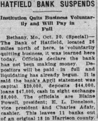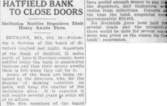 HATFIELD BANK TO CLOSE DOORS Institution Notifies Depositors Their Money Awaits Them. BETHANY, MO., Oct. ing decision of the board of rectors reached last night. depositors of the Bank of Hatfield, 25 miles north notified today the bank suspending business and that their awaits them in full when they call for Assets the bank are tained by the for the purpose notes, will charter of the institution alive. expected require several years settle of The five members the board have pooled enough money to pay the depositors, and themselves realize from collections. Deposits the time the bank suspended No dividends have been paid several years and there done for more as the reason for the bank' suspension.
