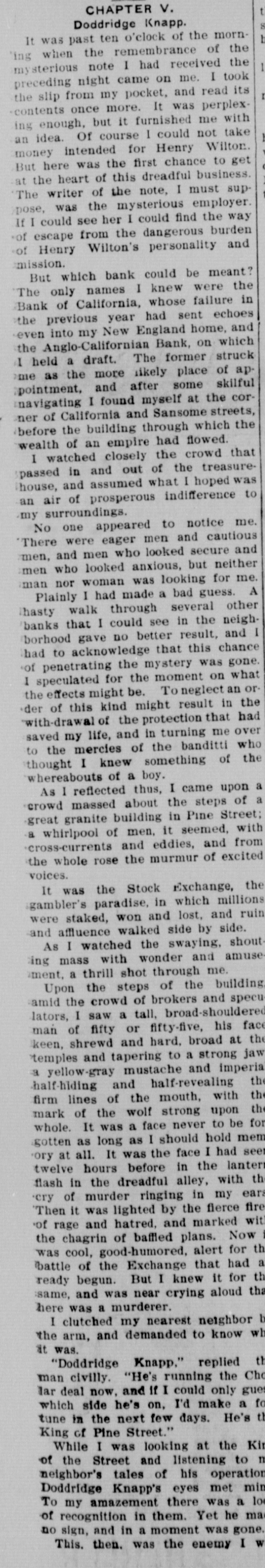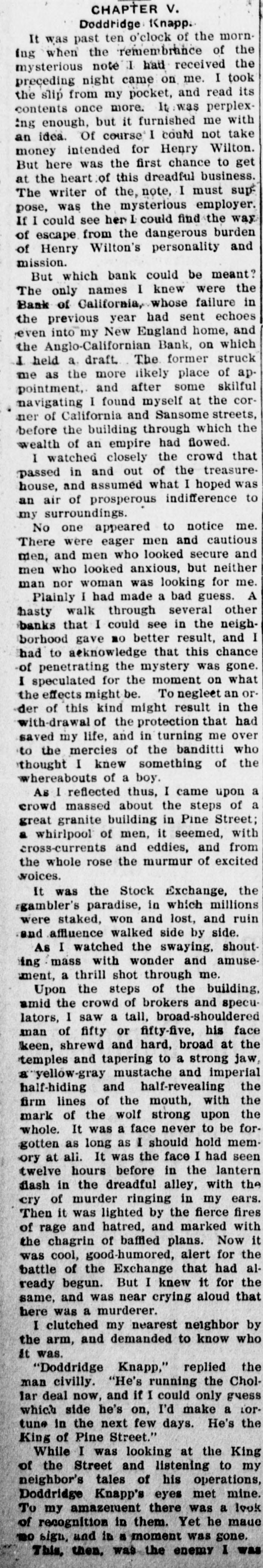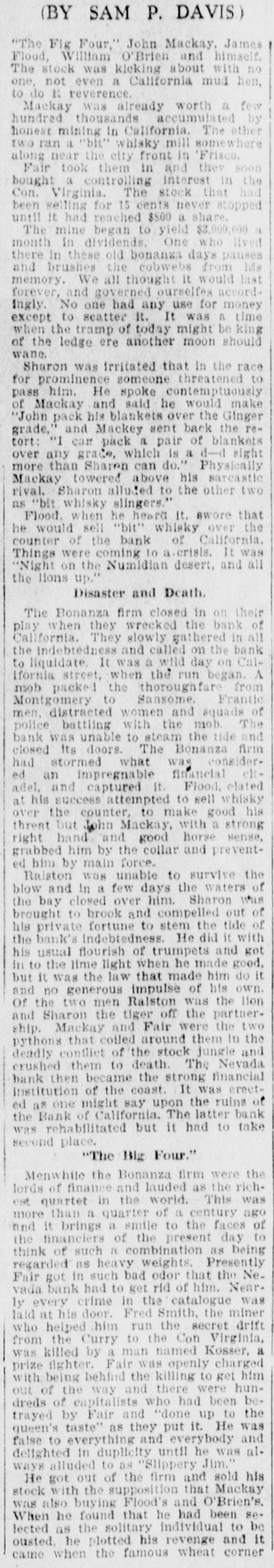 (BY SAM P. DAVIS) "The Fig Four," John Mackay. James Flood, William O'Brien and himself. The stock was kleking about with no one, not even a California mud hen, to do R reverence. Mackay was already worth a few hundred thousands accumulated by honest mining in California. The other two ran a "bit" whisky mill somewhere along near the city front in Frisco. Fair took them in and thev soon bought a controlling interest in the Con. Virginia. The stock that had been selling for 15 cents never stopped until It had reached $800 a share. The mine began to yield $3,000,000 I month in dividends. One who lived there in these old bonanza days pauses and brushes the cobwebs from his memory. We all thought it would last forever, and governed ourselfes accordIngly. No one had any use for money except to seatter It. It was a time when the tramp of today might be king of the ledge ere another moon should wane. Sharon was irritated that in the race for prominence someone threatened to pass him. He spoke contemptuously of Mackay and said he would make "John pack his blankets over the Ginger grade," and Mackey sent back the retort: "I can pack a. pair of blankets over any grade, which is a d-d sight more than Sharen can do." Physically Mackay towered above his sarcastic rival. Sharon alluded to the other two as "bit whisky slingers." Flood, when he heard it, swore that he would sell "bit" whisky over the counter of the bank of California. Things were coming to a.crisis. It was "Night on the Numidian desert, and all the lions up." Disaster and Death. The Bonanza firm closed in on their play when they wrecked the bank of California. They slowly gathered in all the indebtedness and called on the bank to liquidate. It was a wild day on California street, when the run began. A mob packed the thoroughfare from Montgomery to Sansome. Frantic men. distracted women and squads of police battling with the mob. The bank was unable to steam the tide and closed its doors. The Bonanza firm had stormed what was considered an impregnable financial ettadel. and captured it. Flood, elated at his success attempted to sell whisky over the counter, to make good his threat but John Mackay, with a strong right hand and good horse sense, grabbed him by the collar and prevented him by main force. Raiston was unable to survive the blow and in a few days the waters of the bay closed over him. Sharon was brought to brook and compelled out of his private fortune to stem the tide of the bank's indebtedness. He did it with his usual flourish of trumpets and got in to the Time light when he made good, but it was the law that made him do it and no generous impulse of his own. Of the two men Ralston was the lion and Sharon the tiger off the partnership. Mackay and Fair were the two pythons that coiled around them in the deadly conflict of the stock jungle and crushed them to death. The Nevada bank then became the strong financial institution of the coast. It was erected as one might say upon the ruins of the Bank of California. The latter bank was rehabilitated but it had to take second place. "The Big Four." Menwhile the Bonanza firm were the lords of finance and lauded as the richest quartet in the world. This was more than a quarter of a century ago and it brings a smile to the faces of the financiers of the present day to think of such a combination as being regarded as heavy weights. Presently Fair got in such bad odor that the Ne. vada bank had to get rid of him. Nearly every crime in the catalogue was laid at his door. Fred Smith, the miner who helped him run the secret drift from the Curry to the Con Virginia, was killed by a man named Kosser, a prize fighter. Fair was openly charged with being behind the killing to get him out of the way and there were hundreds of capitalists who had been be. trayed by Fair and "done up to the queen's taste" as they put it. He was