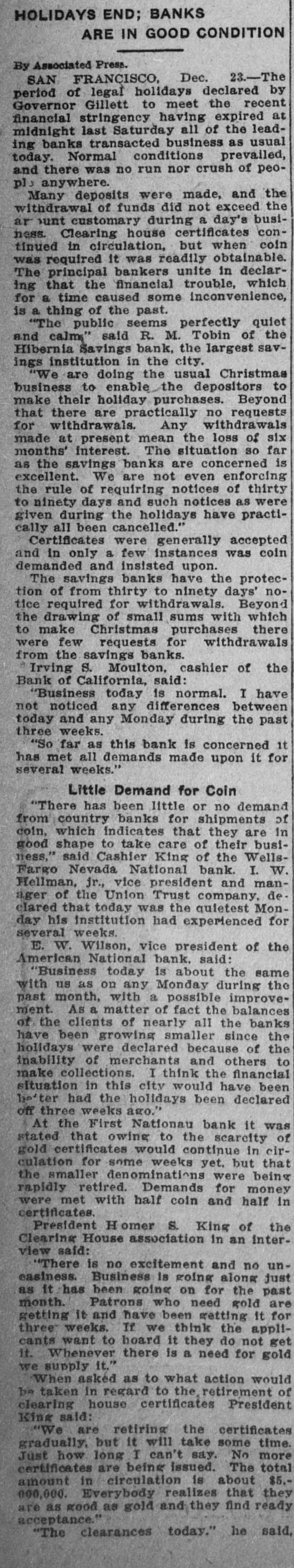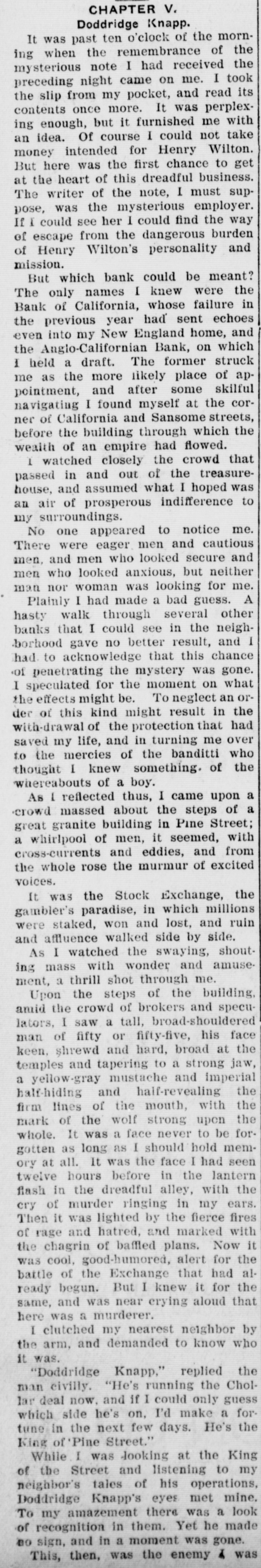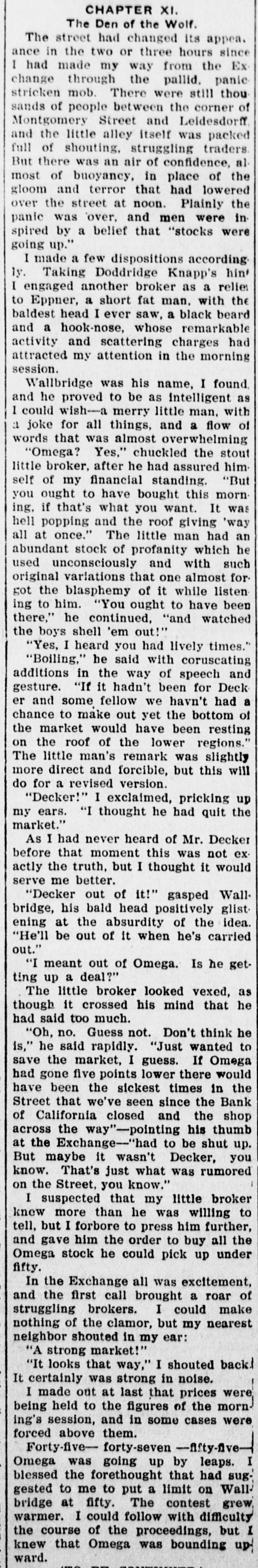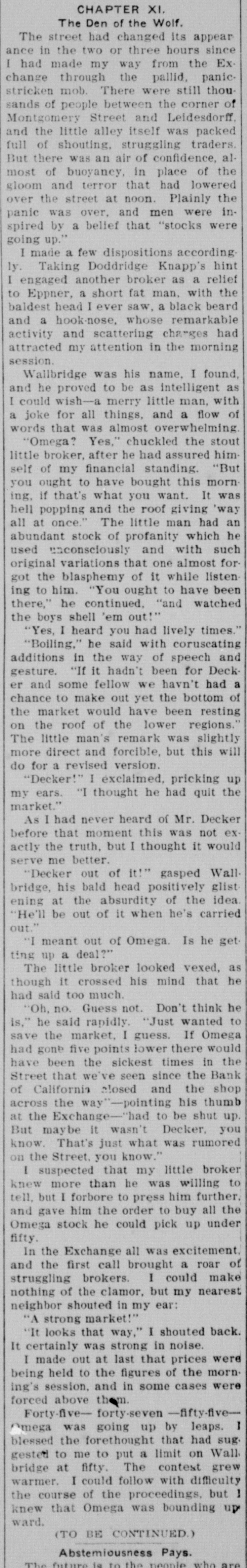 (BY SAM P. DAVIS) "The Fig Four," John Mackay. James Flood, William O'Brien and himself. The stock was kleking about with no one, not even a California mud hen, to do R reverence. Mackay was already worth a few hundred thousands accumulated by honest mining in California. The other two ran a "bit" whisky mill somewhere along near the city front in Frisco. Fair took them in and thev soon bought a controlling interest in the Con. Virginia. The stock that had been selling for 15 cents never stopped until It had reached $800 a share. The mine began to yield $3,000,000 I month in dividends. One who lived there in these old bonanza days pauses and brushes the cobwebs from his memory. We all thought it would last forever, and governed ourselfes accordIngly. No one had any use for money except to seatter It. It was a time when the tramp of today might be king of the ledge ere another moon should wane. Sharon was irritated that in the race for prominence someone threatened to pass him. He spoke contemptuously of Mackay and said he would make "John pack his blankets over the Ginger grade," and Mackey sent back the retort: "I can pack a. pair of blankets over any grade, which is a d-d sight more than Sharen can do." Physically Mackay towered above his sarcastic rival. Sharon alluded to the other two as "bit whisky slingers." Flood, when he heard it, swore that he would sell "bit" whisky over the counter of the bank of California. Things were coming to a.crisis. It was "Night on the Numidian desert, and all the lions up." Disaster and Death. The Bonanza firm closed in on their play when they wrecked the bank of California. They slowly gathered in all the indebtedness and called on the bank to liquidate. It was a wild day on California street, when the run began. A mob packed the thoroughfare from Montgomery to Sansome. Frantic men. distracted women and squads of police battling with the mob. The bank was unable to steam the tide and closed its doors. The Bonanza firm had stormed what was considered an impregnable financial ettadel. and captured it. Flood, elated at his success attempted to sell whisky over the counter, to make good his threat but John Mackay, with a strong right hand and good horse sense, grabbed him by the collar and prevented him by main force. Raiston was unable to survive the blow and in a few days the waters of the bay closed over him. Sharon was brought to brook and compelled out of his private fortune to stem the tide of the bank's indebtedness. He did it with his usual flourish of trumpets and got in to the Time light when he made good, but it was the law that made him do it and no generous impulse of his own. Of the two men Ralston was the lion and Sharon the tiger off the partnership. Mackay and Fair were the two pythons that coiled around them in the deadly conflict of the stock jungle and crushed them to death. The Nevada bank then became the strong financial institution of the coast. It was erected as one might say upon the ruins of the Bank of California. The latter bank was rehabilitated but it had to take second place. "The Big Four." Menwhile the Bonanza firm were the lords of finance and lauded as the richest quartet in the world. This was more than a quarter of a century ago and it brings a smile to the faces of the financiers of the present day to think of such a combination as being regarded as heavy weights. Presently Fair got in such bad odor that the Ne. vada bank had to get rid of him. Nearly every crime in the catalogue was laid at his door. Fred Smith, the miner who helped him run the secret drift from the Curry to the Con Virginia, was killed by a man named Kosser, a prize fighter. Fair was openly charged with being behind the killing to get him out of the way and there were hundreds of capitalists who had been be. trayed by Fair and "done up to the queen's taste" as they put it. He was