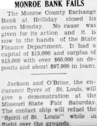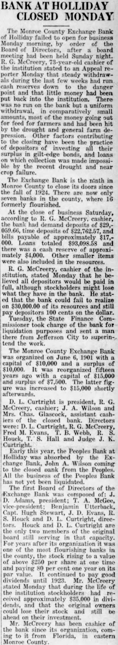 CLOSED MONDAY The Monroe County Exchange Bank Holliday failed to for business Monday by order of the Board of Directors, after board had been held Sunday night. McCreery, cashier of the stated to an Appeal porter Monday that steady withdrawduring the last few weeks had run cash reserves down the danger point and that little money had been put back into the institution. There on the bank but uniform withdrawal, small amounts, most the money going out for feed for and had been hit the drought and general farm deOther factors contributing the closing have been practice depositors investing their surplus in bonds, and loans which collection was made impossible by the recent drought and near crop failure. The Exchange Bank is the ninth in Monroe County close its doors since the fall of 1924. There now only in county, where 16 formerly flourished. At the close of business Saturday, according McCreery. cashier, bank demand deposits of time deposits and payable of Loans totaled and there cash of approximately $4,000. Other smaller items included in the resources. McCreery, cashier of the institution, stated Monday that he lieved would be paid full, although stockholders might lose what they have in the bank. He statthat the bank could fail to realize of resources and still depositors cents the dollar. Tuesday, the State Finance Commissioner took charge of the bank for liquidation purposes and sent man there from Jefferson City to superintend work. The Monroe County Exchange Bank organized with capital $10,000 and surplus $10,000. was reorganized fifteen years with capital $15,000 ago and surplus of The latter was increased to shortly afterwards. Curtright president, cashier; Wilson and Mrs. Chas. Glascock, assistant cashthe closed bank. Directors Curtright, McCreery, Fred Evans, Webb, Houck, Hall and Judge Curtright. Early this year, the Peoples Bank Holliday absorbed the Exchange Bank, John coming the closed bank from the Peoples. All the business of the Peoples Bank been The first Board of Directors of the Bank composed Adams, president; McGee, Benjamin Utterback, Capt. Hugh Stewart, Evans, Houck and Curtright, direcHouck Curtright the only two members of the original board serving that capacity. after of the most flourishing banks in county, the stock rising value above $250 per share one time and cent one year to pay good dividends until 1923. Mr. Monday that during the life institution stockholders had in dividends, that the original owners could lose their stock and still be ahead their Mr. has been cashier of the bank since comfrom Florida, in eastern Monroe County.