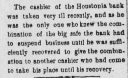 The cashier of the Houstonia bank was taken very ill recently, and as be was the only one who knew the combination of the big safe the bank had to suspend business until he was sufficiently recovered to give the combination to another cashier who had come to take bis place until his recovery.