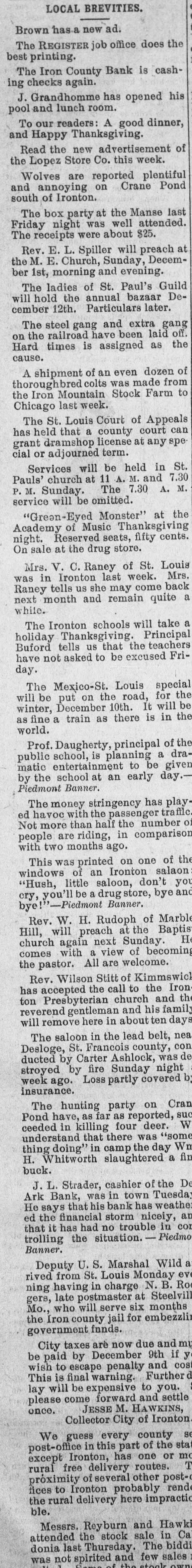 Brown hasa new ad. The REGISTER job office does the best printing. The Iron County Bank is cashing checks again. J. Grandhomme has opened his pool and lunch room. To our readers: A good dinner, and Happy Thanksgiving. Read the new advertisement of the Lopez Store Co. this week. Wolves are reported plentiful and annoying on Crane Pond south of Ironton. The box party at the Manse last Friday night was well attended. The receipts were about $25. Rev. E. L. Spiller will preach at the M. E. Church, Sunday, December 1st, morning and evening. The ladies of St. Paul's Guild will hold the annual bazaar December 12th. Particulars later. The steel gang and extra gang on the railroad have been laid off. Hard times is assigned as the cause. A shipment of an even dozen of thoroughbred colts was made from the Iron Mountain Stock Farm to Chicago last week. The St. Louis Court of Appeals has held that a county court can grant dramshop license at any special or adjourned term. Services will be held in St. Pauls' church at 11 A. M. and 7.30 P. M. Sunday. The 7.30 A. M. service will be omitted. "Green-Eyed Monster" at the Academy of Music Thanksgiving night. Reserved seats, fifty cents. On sale at the drug store. Mrs. V. C. Raney of St. Louis was in Ironton last week. Mrs. Raney tells us she may come back next month and remain quite a while. The Ironton schools will take a holiday Thanksgiving. Principal Buford tells us that the teachers have not asked to be excused Friday. The Mexico-St. Louis special will be put on the road, for the winter, December 10th. It will be as fine a train as there is in the world. Prof. Daugherty, principal of the public school, is planning a dramatic entertainment to be given by the school at an early day.Piedmont Banner. The money stringency has played havoc with the passenger trafflc. Not more than half the number o: people are riding, in comparison with two months ago. This was printed on one of the windows of an Ironton salaon "Hush, little saloon, don't you cry, you'll be a drug store, bye and bye "Piedmont Banner. Rev. W. H. Rudoph of Marble Hill, will preach at the Baptis church again next Sunday. H comes with a view of becoming the pastor. All are welcome. Rev. Wilson Stitt of Kimmswick has accepted the call to the Iron ton Presbyterian church and the reverend gentleman and his family will remove here in about ten days The saloon in the lead belt, nea Desloge, St. Francois county, con ducted by Carter Ashlock, was de stroyed by fire Sunday night week ago. Loss partly covered b) insurance. The hunting party on Cran Pond have, as far as reported, suc ceeded in killing four deer. W understand that there was "some thing doing" in camp the day Wn H. Whitworth slaughtered a fin buck. J. L. Strader, cashier of the De Ark Bank, was in town Tuesda: He says that his bank has weathe ed the financial storm niceiy, an that it has had no trouble in con trolling the situation. - Piedmo Banner. Deputy U. S. Marshal Wild a rived from St. Louis Monday eve ning having in charge N. B. Ro gers, late postmaster at Steelvill Mo., who will serve six months the Iron county jail for embezzlir government fnnds. City taxes are now due and my be paid by December 9th if y wish to escape penalty and cost This is final warning. Further d lay will be expensive to you. please come forward and settle once. JESSE M. HAWKINS, Collector City of Ironton We guess every county se post-office in this part of the sta except Ironton, has one or mc T rural free delivery routes. proximity of several other postfices to Ironton probably rende the rural delivery here impractic ble