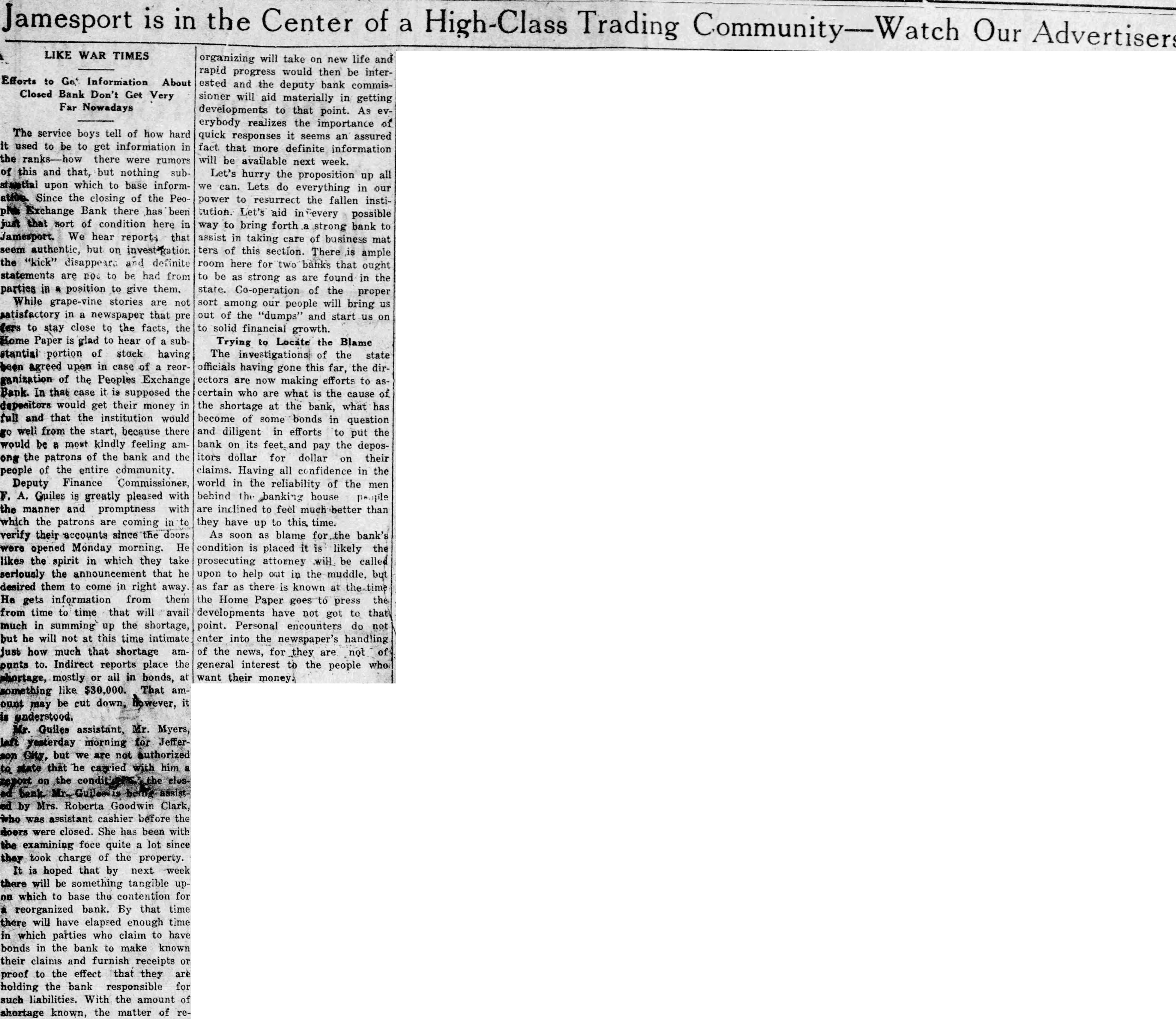 Jamesport is in the Center of a High-Class Trading Community-Watch Our Advertisers LIKE WAR TIMES Efforts to Get Information About Closed Bank Don't Get Very Far Nowadays The service boys tell of how hard it used to be to get information in the ranks- how there were rumors of this and that, but nothing substatetial upon which to base information. Since the closing of the Peopleas Exchange Bank there has been just that sort of condition here in Jamesport. We hear reports that seem authentic, but on investigation the "kick" disappears and definite statements are not to be had from parties in a position to give them. While grape-vine stories are not satisfactory in a newspaper that pre (ers to stay close to the facts, the Home Paper is glad to hear of a substantial portion of stock having been agreed upen in case of a reorganization of the Peoples Exchange Bank. In that case it is supposed the depositors would get their money in full and that the institution would go well from the start, because there would be # most kindly feeling among the patrons of the bank and the people of the entire community. Deputy Finance Commissioner, F. A. Guiles is greatly pleased with the manner and promptness with which the patrons are coming in to verify their accounts since the doors were opened Monday morning. He likes the spirit in which they take seriously the announcement that he desired them to come in right away. He gets information from them from time to time that will avail much in summing up the shortage, but he will not at this time intimate just how much that shortage ampunts to. Indirect reports place the phortage, mostly or all in bonds, at something like $30,000. That amount may be cut down, wever, it is understood. Mr. Guiles assistant, Mr. Myers, left yesterday morning for Jeffer son City, but we are not authorized to state that he carried with him a report on the condit the eles. by Mrs. Roberta Goodwin Clark, who was assistant cashier before the doors were closed. She has been with the examining foce quite a lot since they took charge of the property. It is hoped that by next week there will be something tangible upon which to base the contention for a reorganized bank. By that time there will have elapsed enough time in which parties who claim to have bonds in the bank to make known their claims and furnish receipts or proof to the effect that they are holding the bank responsible for such liabilities. With the amount of shortage known, the matter of re- organizing will take on new life and rapid progress would then be interested and the deputy bank commissioner will aid materially in getting developments to that point. As everybody realizes the importance of quick responses it seems an assured fact that more definite information will be available next week. Let's hurry the proposition up all we can. Lets do everything in our power to resurrect the fallen institution. Let's aid in vevery possible way to bring forth a strong bank to assist in taking care of business mat ters of this section. There is ample room here for two banks that ought to be as strong as are found in the state. Co-operation of the proper sort among our people will bring us out of the "dumps" and start us on to solid financial growth. Trying to Locate the Blame The investigations of the state officials having gone this far, the directors are now making efforts to ascertain who are what is the cause of the shortage at the bank, what has become of some bonds in question and diligent in efforts to put the bank on its feet and pay the depositors dollar for dollar on their claims. Having all confidence in the world in the reliability of the men behind the banking house people are inclined to feel much better than they have up to this, time. As soon as blame for the bank's condition is placed it is likely the prosecuting attorney will be called upon to help out in the muddle. but as far as there is known at the time the Home Paper goes to press the developments have not got to that point. Personal encounters do not enter into the newspaper's handling of the news, for they are not of general interest to the people who want their money.
