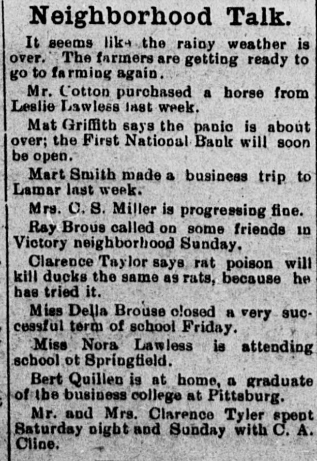 Neighborhood Talk. It seems like the rainy weather is over. The farmers are getting ready to go to farming again. Mr. Cotton purchased a horse from Leslie Lawless last week. Mat Griffith says the panic is about over; the First National Bank will soon be open. Mart Smith made a business trip to Lamar last week. Mrs. C. S. Miller is progressing fine. Ray Brous called on some friends in Victory neighborhood Sunday. Clarence Taylor says rat poison will kill ducks the same as rats, because he has tried it. Mies Della Brouse closed a very successful term of school Friday. Miss Nora Lawless is attending school ot Springfield. Bert Quillen is at home, a graduate of the business college at Pittsburg. Mr. and Mrs. Clarence Tyler spent Saturday night and Sunday with C. A. Cline.