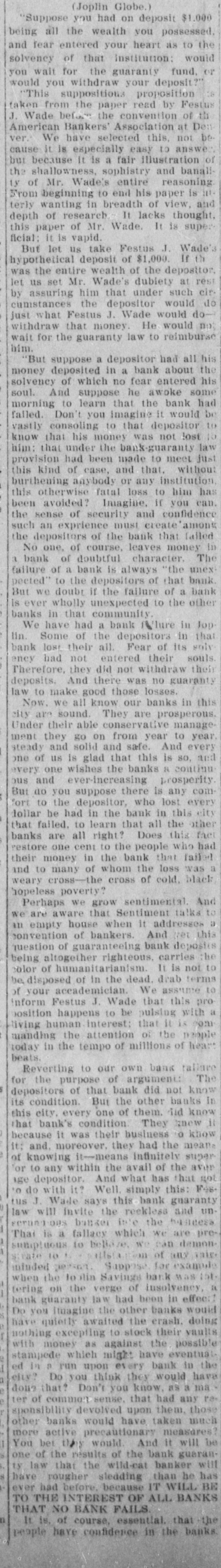NOMINEES FOR CONGRESS. 1st District-Wilbur F. Chamberlain, Hannibal. % 2nd-Edward F. Haley, Moberly. 3rd-Henry L. Eads, Pattonsburg. % X X 4th-Morris A. Reed, St. Joseph. 5th-Edgar C. Ellis, Kansas City. % % 6th-William O. Atkeson, Butler. % 7th-John Whitaker, Weaubleau. 8th-William C. Irwin, Jefferson % City. 9th-Reuben F. Roy, New London. % 10th-Richard Bartholdt, St. Louis. % 11th-William T. Findlay, St. % Louis. % 12th-Harry N. Coudrey, St. Louis. % 13th-Politte Elvins, Elvins. 14th-Chas. A. Crow, Caruthersville. % 15th-Chas. H. Morgan, Joplin. 16th-Arthur P. Murphy, Rolla. department has been entirely self-supporting. The fund which had accumulated in this department during the ten years of the operation of the banking law was $3,638.61. During the four years just preceding the present incumbency nothing whatever was added to that fund. During the three and one-half years of Mr. Swanger's administration the fund has been increased to $8,330.56. Examinations of banks have been rigid, impartial and complete. The reports of the several examiners have been subjected to the most thorough scrutiny. and any violation of the banking laws, or the essential rules of good banking have been called to the attention of the bank without fear or favor and a strict compliance of the law required. During the present administration several banks have been closed. others that were unsafe required to liquidate; others have consolidated, making stronger institutions, and everything done that could be accomplished to place the banking business of the State upon an absolutely safe and stable basis. During Mr. Swanger's administration only four banks and trust companies he has closed resulted in loss to the depositors. One of these was the Middleton Bank at Waverly (resulting from a defaulting cashier). where the depositors will probably lose about 5 to 10 per cent of their deposits. Another is the Joplin Savings Bank, caused by the reckless investments of the president of the institution, where the depositors will lose a percentage of their deposits. Another is the Bankers Trust Company of Kansas City caused by the Brady failure. Reckless investments by the officers of the institution and a slump in their values caused by the panic will cause a loss to the depositors of about 57 per cent of their deposits. Last, but not least, the Salmon & Salmon Bank of Clinton. The most disastrous by far, the causes of the failure of which are well known to the people of the State. It has been the earnest effort of the present administration, whenever It was possible, to prevent receiverships for banks, and many thousands of dollars have been saved to depositors and stockholders by the efforts of Mr. Swanger to