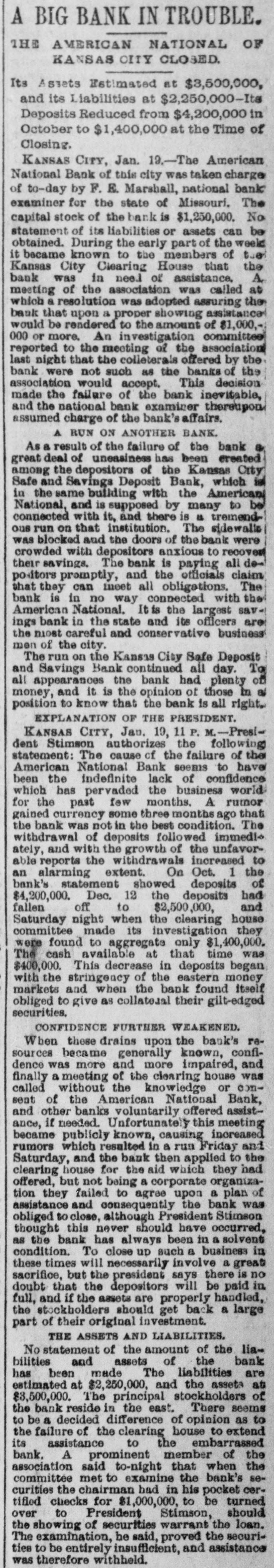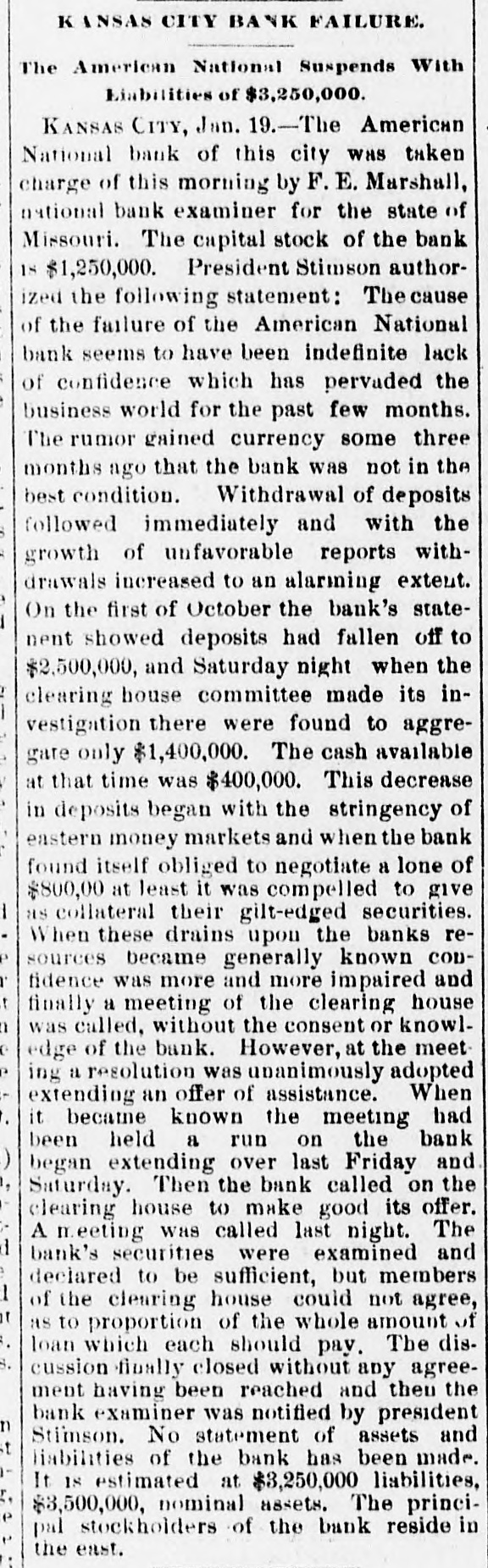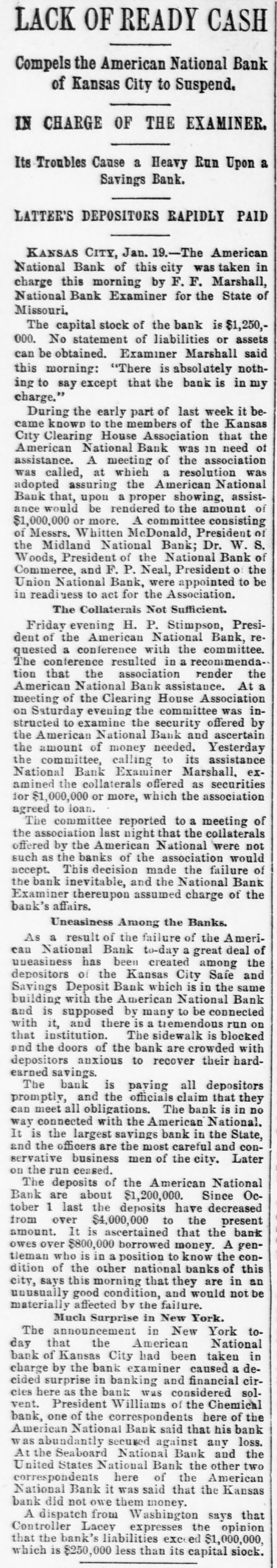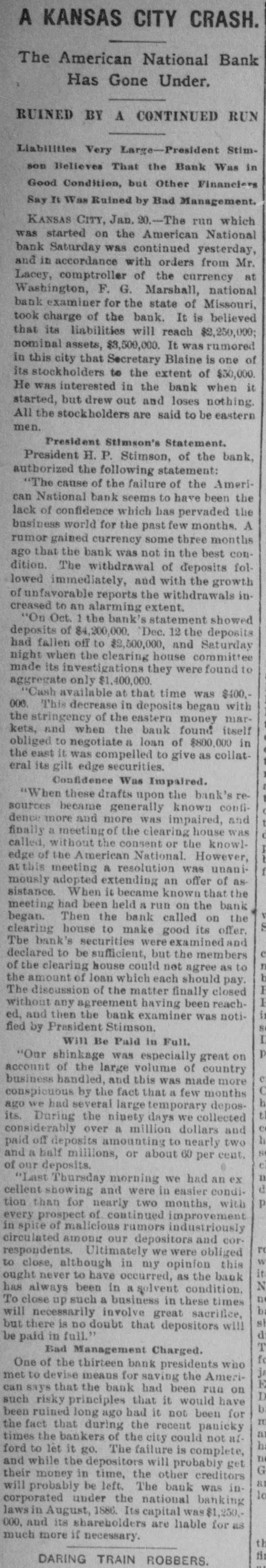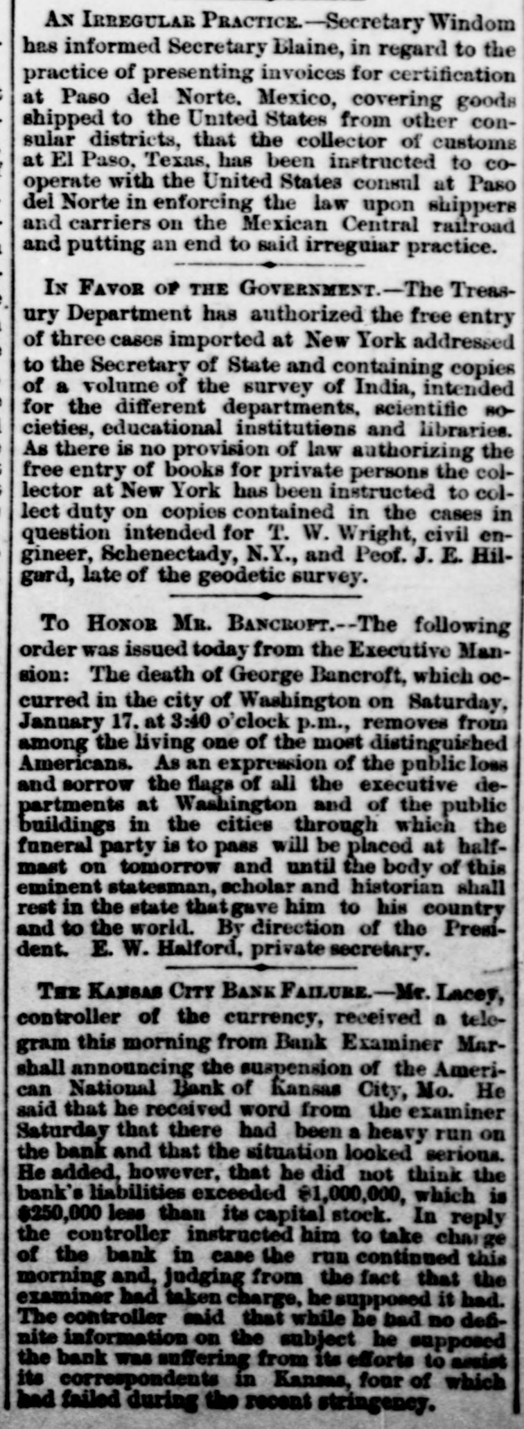 AN IRREGULAR PRACTICE.-Secretary Windom has informed Secretary Blaine, in regard to the practice of presenting invoices for certification at Paso del Norte. Mexico, covering goods shipped to the United States from other consular districts, that the collector of customs at El Paso, Texas, has been instructed to cooperate with the United States consul at Paso del Norte in enforcing the law upon shippers and carriers on the Mexican Central railroad and putting an end to said irregular practice. IN FAVOR OF THE GOVERNMENT.-The Treasury Department has authorized the free entry of three cases imported at New York addressed to the Secretary of State and containing copies of a volume of the survey of India, intended for the different departments, scientific NOcieties, educational institutions and libraries. As there is no provision of law authorizing the free entry of books for private persons the collector at New York has been instructed to collect duty on copies contained in the cases in question intended for T. W. Wright, civil engineer, Schenectady, N.Y., and Peof. J. E. Hilgard, late of the geodetic survey. To HONOR MR. BANCROFT.--The following order was issued today from the Executive Mansion: The death of George Bancroft, which occurred in the city of Washington on Saturday, January 17. at 3:40 o'clock p.m., removes from among the living one of the most distinguished Americans. As an expression of the public loss and sorrow the flags of all the executive departments at Washington and of the public buildings in the cities through which the funeral party is to pass will be placed at halfmast on tomorrow and until the body of this eminent statesman, scholar and historian shall rest in the state thatgave him to his country and to the world. By direction of the President. E. W. Halford, private secretary. THE KANSAS CITY BANK FAILURE.-Mr. Lacey, controller of the currency, received a telegram this morning from Bank Examiner Marshall announcing the suspension of the American National Bank of Kansas City, Mo. He said that he received word from the examiner Saturday that there had been a heavy run on the bank and that the situation looked serious. He added, however, that he did not think the bank's liabilities exceeded $1,000,000, which is $250,000 less than its capital stock. In reply the controller instructed him to take chai ge of the bank in case the run continued this morning and, judging from the fact that the examiner had taken charge, he supposed it had. The controller mid that while he bad no definite information on the subject he supposed the bank was suffering from its efforts to assist its correspondents in Kansas, four of which had failed during the recent stringency.