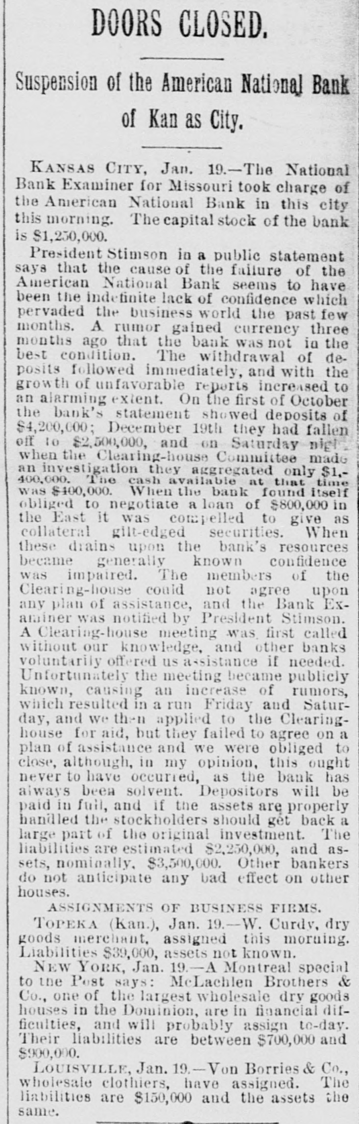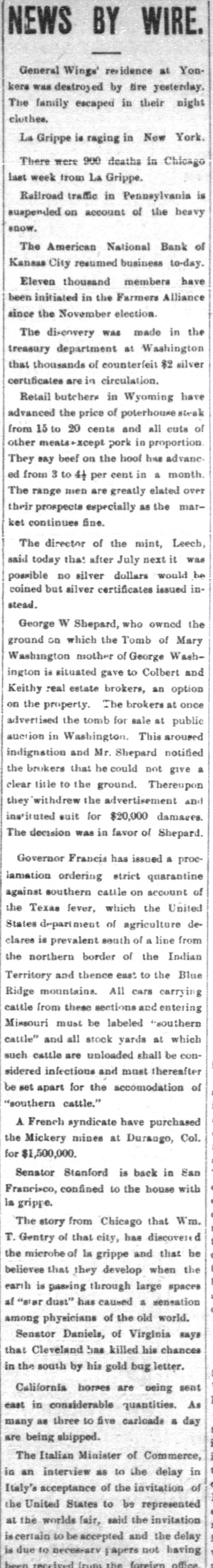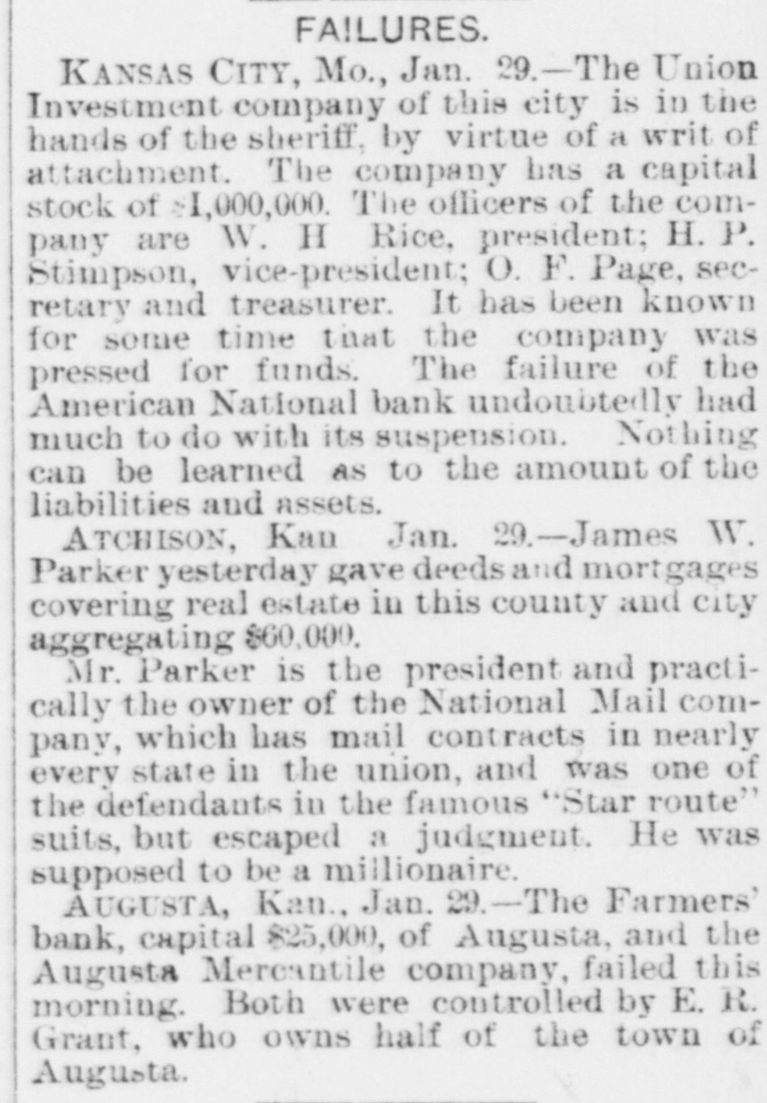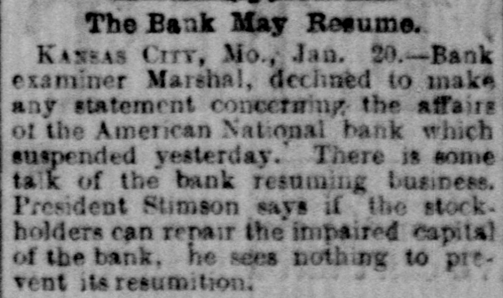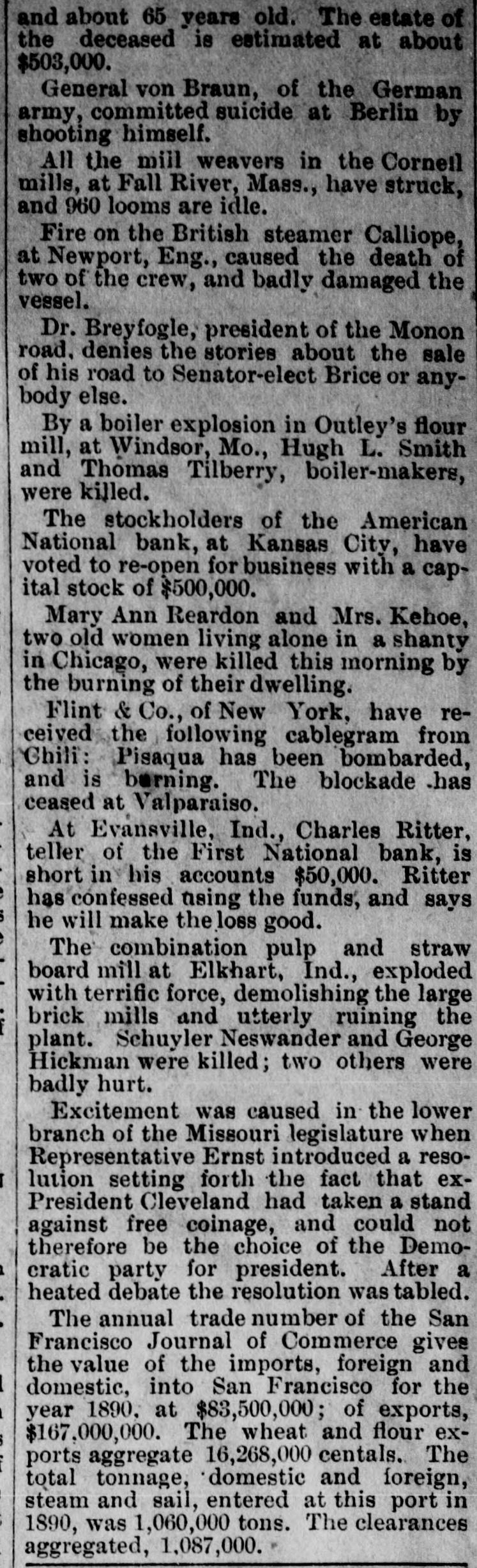 AN IRREGULAR PRACTICE.-Secretary Windom has informed Secretary Blaine, in regard to the practice of presenting invoices for certification at Paso del Norte. Mexico, covering goods shipped to the United States from other consular districts, that the collector of customs at El Paso, Texas, has been instructed to cooperate with the United States consul at Paso del Norte in enforcing the law upon shippers and carriers on the Mexican Central railroad and putting an end to said irregular practice. IN FAVOR OF THE GOVERNMENT.-The Treasury Department has authorized the free entry of three cases imported at New York addressed to the Secretary of State and containing copies of a volume of the survey of India, intended for the different departments, scientific NOcieties, educational institutions and libraries. As there is no provision of law authorizing the free entry of books for private persons the collector at New York has been instructed to collect duty on copies contained in the cases in question intended for T. W. Wright, civil engineer, Schenectady, N.Y., and Peof. J. E. Hilgard, late of the geodetic survey. To HONOR MR. BANCROFT.--The following order was issued today from the Executive Mansion: The death of George Bancroft, which occurred in the city of Washington on Saturday, January 17. at 3:40 o'clock p.m., removes from among the living one of the most distinguished Americans. As an expression of the public loss and sorrow the flags of all the executive departments at Washington and of the public buildings in the cities through which the funeral party is to pass will be placed at halfmast on tomorrow and until the body of this eminent statesman, scholar and historian shall rest in the state thatgave him to his country and to the world. By direction of the President. E. W. Halford, private secretary. THE KANSAS CITY BANK FAILURE.-Mr. Lacey, controller of the currency, received a telegram this morning from Bank Examiner Marshall announcing the suspension of the American National Bank of Kansas City, Mo. He said that he received word from the examiner Saturday that there had been a heavy run on the bank and that the situation looked serious. He added, however, that he did not think the bank's liabilities exceeded $1,000,000, which is $250,000 less than its capital stock. In reply the controller instructed him to take chai ge of the bank in case the run continued this morning and, judging from the fact that the examiner had taken charge, he supposed it had. The controller mid that while he bad no definite information on the subject he supposed the bank was suffering from its efforts to assist its correspondents in Kansas, four of which had failed during the recent stringency.