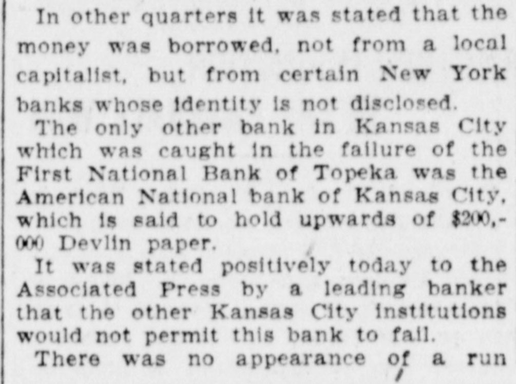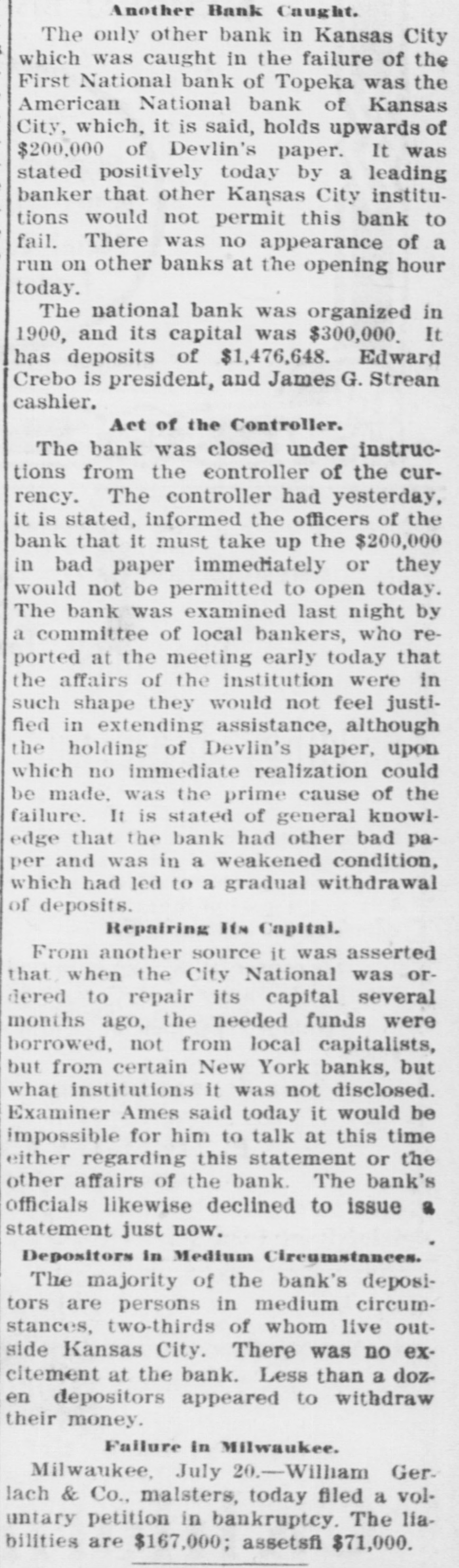 Another Bank Caught. The only other bank in Kansas City which was caught in the failure of the First National bank of Topeka was the American National bank of Kansas City, which, it is said, holds upwards of $200,000 of Devlin's paper. It was stated positively today by a leading banker that other Kansas City institutions would not permit this bank to fail. There was no appearance of a run on other banks at the opening hour today. The national bank was organized in 1900, and its capital was $300,000. It has deposits of $1,476,648. Edward Crebo is president, and James G. Stream cashier. Act of the Controller. The bank was closed under instructions from the controller of the currency. The controller had yesterday, it is stated, informed the officers of the bank that it must take up the $200,000 in bad paper immediately or they would not be permitted to open today. The bank was examined last night by a committee of local bankers, who reported at the meeting early today that the affairs of the institution were in such shape they would not feel justified in extending assistance, although the holding of Devlin's paper, upon which no immediate realization could be made. was the prime cause of the failure. It is stated of general knowledge that the bank had other bad paper and was in a weakened condition, which had led to a gradual withdrawal of deposits. Repairing Its Capital. From another source it was asserted that when the City National was ordered to repair its capital several months ago, the needed funds were borrowed, not from local capitalists, but from certain New York banks, but what institutions it was not disclosed. Examiner Ames said today it would be impossible for him to talk at this time either regarding this statement or the other affairs of the bank. The bank's officials likewise declined to issue a statement just now. Depositors in Medium Circumstances. The majority of the bank's depositors are persons in medium circumstances, two-thirds of whom live outside Kansas City. There was no exeitement at the bank. Less than a dozen depositors appeared to withdraw their money. Failure in Milwaukee. Milwaukee, July 20.-William Gerlach & Co., malsters, today filed a voluntary petition in bankruptcy. The liabilities are $167,000; assetsfi $71,000.