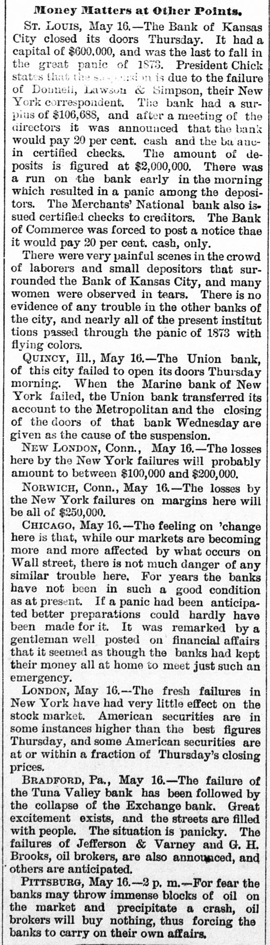 Money Matters at Other Points. ST. LOUIS, May 16.-The Bank of Kansas City closed its doors Thursday. It had a capital of $600,000, and was the last to fall in the great panic of 1873. President Chick states that is due to the failure of Donnell, Lawson & Simpson, their New York correspondent. The bank had a surpius of $106,688, and after a meeting of the directors it was announced that the bank would pay 20 per cent. cash and the ba anein certified checks. The amount of deposits is figured at $2,000,000. There was a run on the bank early in the morning which resulted in a panic among the depositors. The Merchants' National bank also issued certified checks to creditors. The Bank of Commerce was forced to post a notice thae it would pay 20 per cent. cash, only. There were very painful scenes in the crowd of laborers and small depositors that surrounded the Bank of Kansas City, and many women were observed in tears. There is no evidence of any trouble in the other banks of the city, and nearly all of the present institut tions passed through the panic of 1873 with flying colors. QUINCY, III., May 16.-The Union bank, of this city failed to open its doors Thursday morning. When the Marine bank of New York failed, the Union bank transferred its account to the Metropolitan and the closing of the doors of that bank Wednesday are given as the cause of the suspension. NEW LONDON, Conn., May 16.-The losses here by the New York failures will probably amount to between $100,000 and $200,000. NORWICH, Conn., May 16.-The losses by the New York failures on margins here will be all of $250,000. CHICAGO, May 16.-The feeling on 'change here is that, while our markets are becoming more and more affected by what occurs on Wall street, there is not much danger of any similar trouble here. For years the banks have not been in such a good condition as at present. If a panic had been anticipated better preparations could hardly have been made for it. It was remarked by a gentleman well posted on financial affairs that it seemed as though the banks had kept their money all at home to meet just such an emergency. LONDON, May 16.-The fresh failures in New York have had very little effect on the stock market. American securities are in some instances higher than the best figures Thursday, and some American securities are at or within a fraction of Thursday's closing prices. BRADFORD, Pa., May 16.-The failure of the Tuna Valley bank has been followed by the collapse of the Exchange bank. Great excitement exists, and the streets are filled with people. The situation is panicky. The failures of Jefferson & Varney and G.H. Brooks, oil brokers, are also announced, and others are anticipated. PITTSBURG, May 16.-2 p. m.-For fear the banks may throw immense blocks of oil on the market and precipitate a crash, oil brokers will buy nothing, thus forcing the banks to carry on their own affairs.