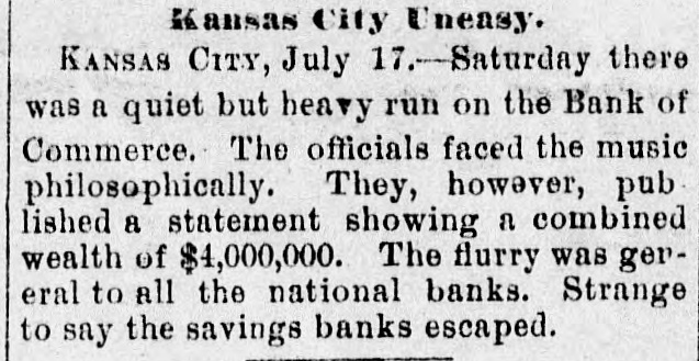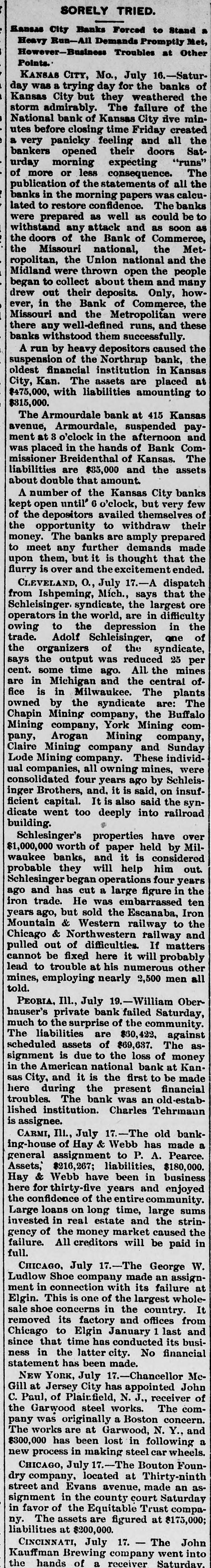 SORELY TRIED. Kansas City Banks Forced to Stand Heavy Run-All Demands Promptly However-Business Troubles at Other Points. KANSAS CITY, Mo., July 16.-Saturday was a of the storm the Kansas admirably. City trying but day they The for weathered failure the banks of rive minutes created a and the National very before panicky bank closing of feeling Kansas time Friday City all bankers opened their doors Saturday morning expecting "runs" of more or less consequence. The publication of the statements of all the banks in the morning papers was calculated to restore confidence. The banks were prepared as well as could be to withstand any attack and as soon as the doors of the Bank of Commerce, the Missouri national, the Metropolitan, the Union national and the Midland were thrown open the people began to collect about them and many drew out their deposits. Only, however, in the Bank of Commerce, the Missouri and the Metropolitan were there any well-defined runs, and these banks withstood them successfully. A run by heavy depositors caused the suspension of the Northrup bank, the oldest financial institution in Kansas City, Kan. The assets are placed at $475,000, with liabilities amounting to $315,000. The Armourdale bank at 415 Kansas avenue, Armourdale, suspended payment at 3 o'clock in the afternoon and was placed in the hands of Bank Commissioner Breidenthal of Kansas. The liabilities are $35,000 and the assets about double that amount. A number of the Kansas City banks kept open until' 6 o'clock, but very few of the depositors availed themselves of the opportunity to withdraw their money. The banks are amply prepared to meet any further demands made upon them, but it is thought that the flurry is over and the excitement ended. CLEVELAND, o., July 17.-A dispatch from Ishpeming, Mich., says that the Schleisinger syndicate, the largest ore operators in the world, are in difficulty owing to the depression in the trade. Adolf Schleisinger, one of the organizers of the syndicate, says the output was reduced 25 per cent. some time ago. All the mines are and central owned fice in is Michigan by in the Milwaukee. syndicate the The are: plants The ofBuffalo pany, Mining Chapin Mining Arogan company, company, York Mining Mining the company, comand were Claire ual Lode companies, Mining Mining company. all company owning These mines, Sunday individconsolidated four years ago by Schleisinger Brothers, and. it is said, on insufficient capital. It is also said the syndicate went too deeply into railroad building. Schlesinger's properties have over $1,000,000 worth of paper held by Milwaukee banks, and it is considered probable they will help him out. Schlesinger began operations four years ago and has cut a large figure in the iron trade. He was embarrassed ten years ago, but sold the Escanaba, Iron Mountain & Western railway to the Chicago & Northwestern railway and pulled out of difficulties. If matters cannot be fixed here it will probably lead to trouble at his numerous other mines, employing nearly 2,500 men all told. PEORIA. Ill., July 19.-William Oberhauser's private bank failed Saturday, much to the surprise of the community. The liabilities are $60,422. against scheduled assets of $69,637. The assignment is due to the loss of money in the American national bank at Kansas City, and it is the first to be made here during the present financial troubles. The bank was an old-established institution. Charles Tehrmaun is assignee. CARMI, Ili., July 17.-The old banking-house of Hay & Webb has made a general assignment to P. A. Pearce. Assets, $216,267; liabilities, $180,000. Hay & Webb have been in business here for thirty-five years and enjoyed the confidence of the entire community. Large loans on long time, large sums invested in real estate and the stringency of the money market caused the failure. All creditors will be paid in full. CHICAGO, July 17.-The George W. Ludlow Shoe company made an assignment in connection with its failure at Elgin. This is one of the largest wholeale shoe concerns in the country. It removed its factory and offices from Chicago to Elgin January 1 last and since that time has conducted its business in the latter city. No financial statement has been made. NEW YORK, July 17.-Chancellor MeGill at Jersey City has appointed John Paul, of Plainfield, N. J., receiver of the Garwood steel works. The company was originally a Boston concern. The works are at Garwood, N. Y., and $300,000 has been lost in following a new process in making steel car wheels CHICAGO, July 7.-The Bouton Foundry company, located at Thirty-ninth street and Evans avenue, made an ascourt in signment favor of in the the Equitable county Trust Saturday company. The assets are figured at $175,000; went into liabilities Kauffman CINCINNATI, at Brewing $200,000. July company 17. The John the hands of a receiver Saturday.
