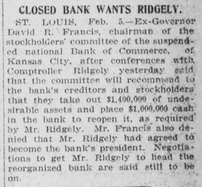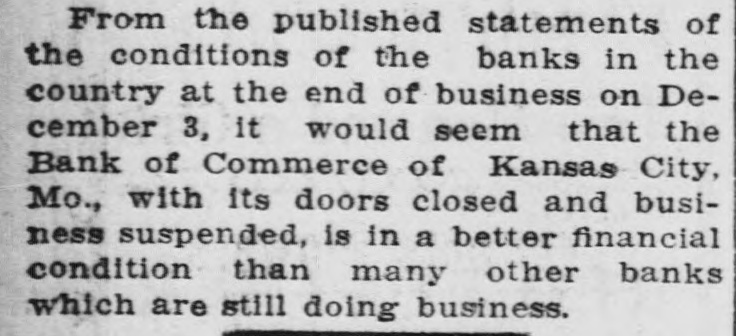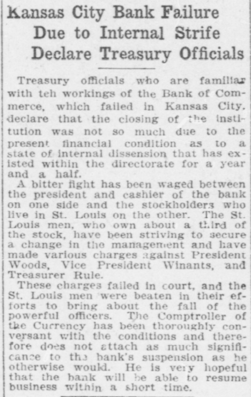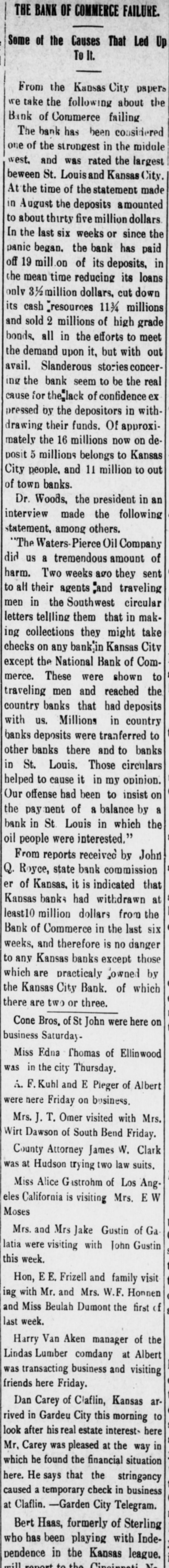 DOES NOT HURT. (Continued from Preceding Page.) thus far do not seem to be in any speclal trouble. The funds which they may have had on deposit with the National Bank of Commerce comprise such a small portion of their total resources that I do not anticipate there will be any serious disturbances. Nor is it at all unlikely that these Kansas banks will eventually recover by far the greater portion of their deposits. Of course it may tie them up for a time, but they were tied up considerably anyway, and I doubt whether it will make very much difference." Secretary of State C. E. Denton, who is the owner of a number of banks in southern Kansas, said: "Of course this is a hard blow, but it is not nearly so bad as it would have been if it had come thirty days ago. The Bank of Commerce made a gallant fight for its life, and the thing that pulled it down was its payments aggregating $19,000,000, most of which went to help its correspondent banks in Kansas. There are about forty banks in Kansas which are owned or controlled by the Bank of Commerce." Doesn't Affect State. State Treasurer Mark Tulley said: "This flurry in Kansas City does not trouble the state in the least. The state's money is absolutely secure, even though every bank in the state should break. Each depository bank has in the state treasury bonds worth several times the size of its deposit. I do not believe that there will a very serious difference in the existing conditions in Kansas, though it may be some time before the bankers take off the 'lid.' Attorney General F. S. Jackson, who is part owner of a bank in his county, said this morning: "We have known for a week that this was likely to happen, and have canvassed the situation carefully. We believe that there is no doubt that every bank will get all of its money back out of the assets of the Bank of Commerce. Consequently I am not worried about the condition of the bank in which I am interested, because I know we are safe. I have also concluded that the 'lid' which the bankers put on withdrawals was a very good thing. Up to the present time I had believed that was entirely unnecessary. I now am convinced that it was a very safe move, and will do much to allay any fear of a run, because everybody knows that no one else can start anything." No Large Santa Fe Balance. There have been persistent rumors that the Santa Fe railroad was caught with large deposits in the Bank of Commerce but this is denied by the treasurer of the road, E. L. Copeland, who said: "I do not understand how such a rumor could have been started as we have but a small balance on deposit in the suspended bank. Our large account is carried with the First National Bank of Kansas City, the largest institution in the city and the account carried with the Bank of Commerce was merely for our own accommodation in taking care of matters handled through that institution. "I just had a talk with Dr. Woods, the president of the Bank of Commerce, during which he assured me that the assets of the closed bank will liquidate all outstanding indebtedness and that the bank will pay dollar for dollar. Over $18,000,000 has been paid out by the institution during the past thirty days; a wonderful record for any banking institution and this of itself is an evidence of the solvency of the institution.