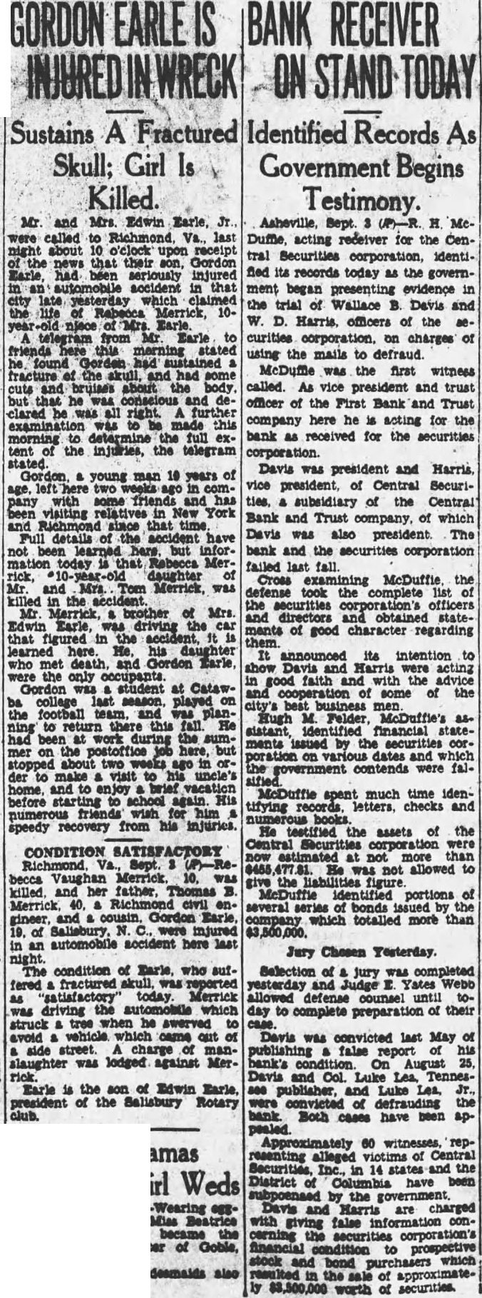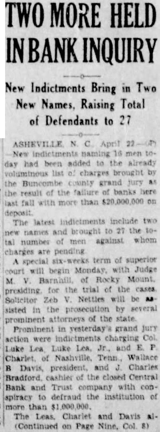 Asheville Dec. collapse of he Central Bank and Trust Company if which Wallace B. Davis was pres ent, depicts a romance of finance hat faded into a ghastly tragedy. Its powerful influence spread to all sections of western North Carolina and with its closing last month, lozen banks closed their doors in symIts ramificat ons reached into all arts of the south and middlewest: is manipulations in finance caused ven the money-wise New York bankrs to give For a decade, it dictated the poliies and dominated the pol tieal leadrs of Asheville and Buncombe counWith only a few exceptions, it sereed what men should be elected to ffice. It dominated civic and comthe hurches were not overlooked. In Control For Years. For years, the finanial, business and real estate fields Asheville and Buncombe county It decided what public improvements should be made, what streets should paved, what new avenues of travel should be established. It fixed prices on real estate by its decisions to buy and sell. It determined the success or fa lure of businesses by its support or derision. In its collapse, the wealth and inluence of its friends tottered: its Ponzi-methods of finance bobbed into the pitiless spotlight of public ty; its political supporters were pushed to of disaster Innocent de the brink lost their life savings, the positors ruling class of the and county were hard put to defend their power. Never has financial institution in western North Carolina dominated so completely Never has one spread its influence into so many different fields, among so many Ifferent peoples. With the collapse of the called real estate boom in Asheville and western North Carolina, the strength of the Central, Bank and Trust company was severely tested. But it required years of depression and poor business to dip into its powerful reserves.