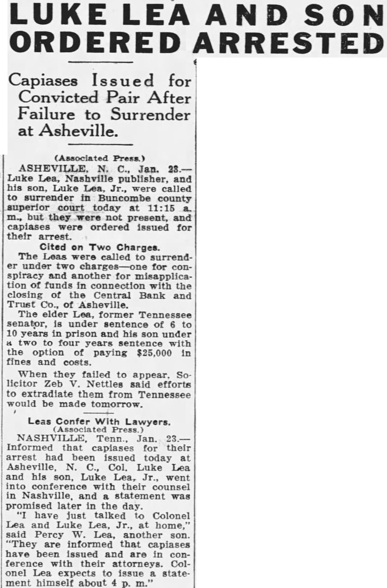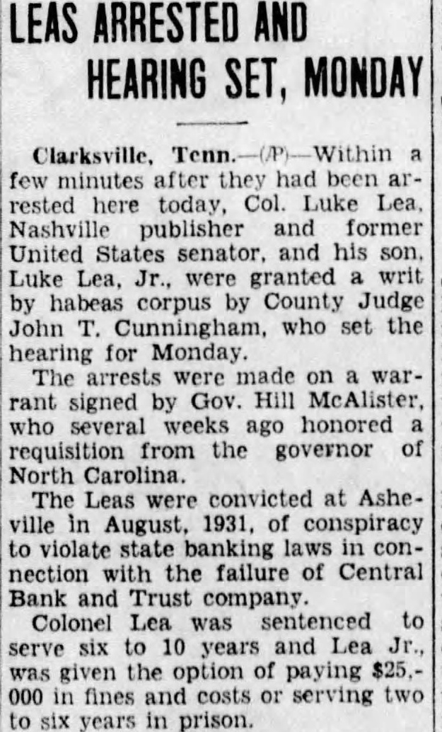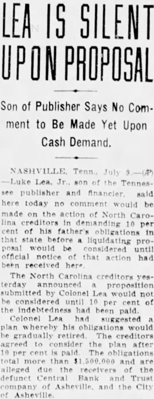 With the bank's suspens'o off cials began the task of unraveling th real story. In all sections of th south. there bobbed up transaction with the Asheville institution. Caldwell and company, the Nash ville investment banking house which collapsed several weeks previously was accused by the bank of convert ing Asheville city notes to its on use. information had been divulg ed, and the city had been credited W th the entire proceeds of the $305 000 note: although $55,000 was n nut on the books until the final day the bank was in business. The Guaranty Bank and Trust com pany, of Alexandria, La., filed a peti tion in federal court at Nashvil Saturday, December 6. asking fr possession of $150,000 in certificates of deposit upon the Central bank wh ch had been deposited by th closed Bank of Tennessee as a gual antee of deposits. The Bank of Ter nessee was a subsidiary of Caldwe and Tennessee papers, including th Chattanooga Times, had repeated! accused Gov. Henry H. Horton, Nashville publisher and former United States senator. and Rogers Ca well, head of the defunct Caldwell ar company. of nolitical alliance The also said that Caldwell and Lea had conferred with W. B. Davis, preside of the closed Central Bank and Trus company here. concerning the forms tion of southern investment bankin heuse. The Central bank was frequent mentioned as allied with the Caldwell Lea interests. financially and polit allv, and its failure was generally at tributed by Tennessee ะดัะตะณะฒ to close connection with the Caldwel Lea-Horton combine. Among the deposit securities hel by the tv of Asheville as a gua antee of its deposits in the Centre bank were notes. totaling more than $40 000. either indorsed by Col Ler or protected by collateral in newspa Ders and corporations owned by him The city might have to ask for a re order to force During the last fortnight. informr tion has trickled into the city about the county be ng used by Caldwell inter former Chairman Newton M. Ander son accuses the Central bank of mis apprepriating $875,000 which had been deposited in the bank to pay of notes due between November 12 an 15.