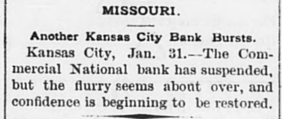 MISSOURI. Another Kansas City Bank Bursts. Kansas City, Jan. 31.--The Commercial National bank has suspended, but the flurry seems about over, and confidence is beginning to be restored.