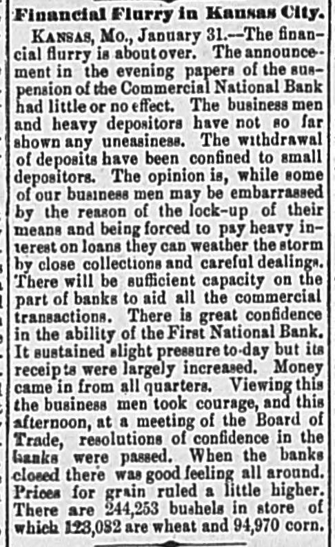 Financial Flurry in Kansas City. KANSAS, Mo., January 31.--The financial flurry is aboutover. The announcement in the evening papers of the suspension of the Commercial National Bank had little or no effect. The business men and heavy depositors have not 80 far shown any uneasiness. The withdrawal of deposits have been confined to small depositors. The opinion is, while some of our business men may be embarrassed by the reason of the lock-up of their means and being forced to pay heavy interest on loans they can weather the storm by close collections and careful dealinga. There will be sufficient capacity on the part of banks to aid all the commercial transactions. There is great confidence in the ability of the First National Bank. It sustained slight pressure to-day but its receipts were largely increased. Money came in from all quarters. Viewing this the business men took courage, and this afternoon, at a meeting of the Board of Trade, resolutions of confidence in the banks were passed. When the banks closed there was good feeling all around. Prices for grain ruled a little higher. There are 244,253 bushels in store of which 123,082 are wheat and 94,970 corn.