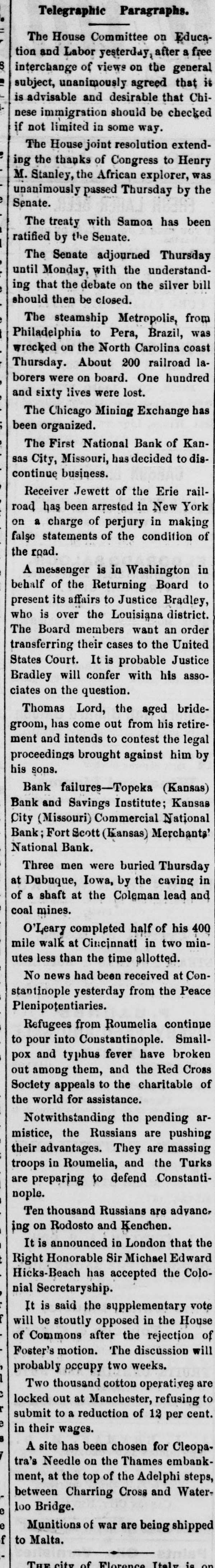 tion and Labor yesterday, after a free interchange of views on the general subject, unanimously agreed that it is advisable and desirable that Chinese immigration should be checked if not limited in some way. The House joint resolution extending the thanks of Congress to Henry M. Stanley, the African explorer, was unanimously passed Thursday by the Senate. The treaty with Samoa has been ratified by the Senate. The Senate adjourned Thursday until Monday, with the understanding that the debate on the silver bill should then be closed. The steamship Metropolis, from Philadelphia to Pera, Brazil, was wrecked on the North Carolina coast Thursday. About 200 railroad laborers were on board. One hundred and sixty lives were lost. The Chicago Mining Exchange has been organized. The First National Bank of Kansas City, Missouri, has decided to discontinue business. Receiver Jewett of the Erie railroad has been arrested in New York on a charge of perjury in making false statements of the condition of the road. A messenger is in Washington in behalf of the Returning Board to present its affairs to Justice Bradley, who is over the Louisiana district. The Board members want an order transferring their cases to the United States Court. It is probable Justice Bradley will confer with his associates on the question. Thomas Lord, the aged bridegroom, has come out from his retirement and intends to contest the legal proceedings brought against him by his sons. Bank failures—Topeka (Kansas) Bank and Savings Institute; Kansas City (Missouri) Commercial National Bank; Fort Scott (Kansas) Merchants' National Bank. Three men were buried Thursday at Dubuque, Iowa, by the caving in of a shaft at the Coleman lead and coal mines. O'Leary completed half of his 400 mile walk at Cincinnati in two minutes less than the time allotted. No news had been received at Constantinople yesterday from the Peace Plenipotentiaries. Refugees from Roumelia continue to pour into Constantinople. Smallpox and typhus fever have broken out among them, and the Red Cross Society appeals to the charitable of the world for assistance. Notwithstanding the pending armistice, the Russians are pushing their advantages. They are massing troops in Roumelia, and the Turks are preparing to defend Constantinople. Ten thousand Russians are advanc, ing on Rodosto and Kenchen. It is announced in London that the Right Honorable Sir Michael Edward Hicks-Beach has accepted the Colonial Secretaryship. It is said the supplementary vote will be stoutly opposed in the House of Commons after the rejection of Foster's motion. The discussion will probably occupy two weeks. Two thousand cotton operatives are locked out at Manchester, refusing to submit to a reduction of 12 per cent. in their wages. A site has been chosen for Cleopatra's Needle on the Thames embankment, at the top of the Adelphi steps, between Charring Cross and Waterloo Bridge. Munitions of war are being shipped