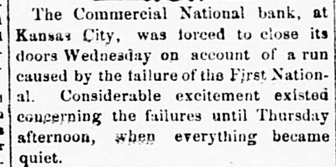 The Commercial National bank, at Kansas City, was forced to close its doors Wednesday on account of a run caused by the failure of the First National. Considerable excitement existed concerning the failures until Thursday afternoon, when everything became quiet.