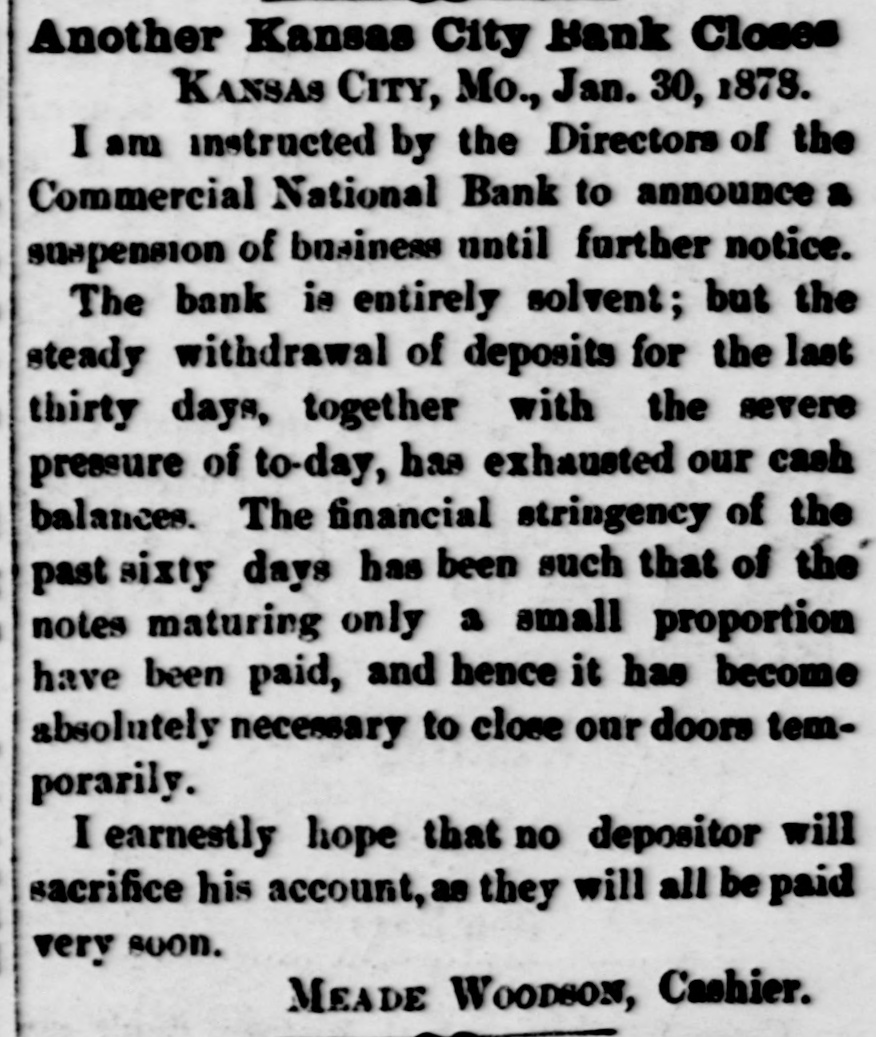 Another Kansas City Bank Closes KANSAS CITY, Mo., Jan. 30, 1878. I am instructed by the Directors of the Commercial National Bank to announce a suspension of business until further notice. The bank is entirely solvent; but the steady withdrawal of deposits for the last thirty days, together with the severe pressure of to-day, has exhausted our cash balances. The financial stringency of the past sixty days has been such that of the notes maturing only a small proportion have been paid, and hence it has become absolutely necessary to close our doors temporarily. I earnestly hope that no depositor will sacrifice his account, as they will all be paid very soon. MEADE WOODSON, Cashier.