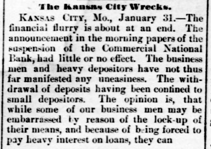 The Kansas City Wrecks. KANSAS CITY, Mo., January 31.-The financial flurry is about at an end. The announcement in the morning papers of the suspension of the Commercial National Bank, had little or no effect. The business men and heavy depositors have not thus far manifested any uneasiness. The withdrawal of deposits having been contined to small depositors. The opinion is, that while some of our business men may be embarrassed by reason of the lock-up of their means, and because of being forced to pay heavy interest on loans, they can