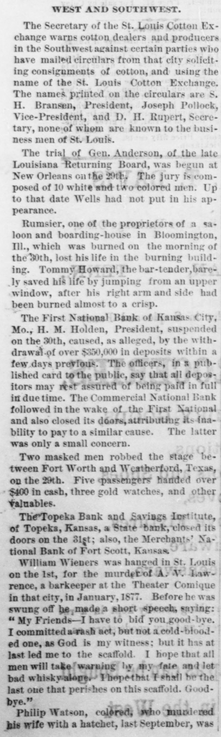 WEST AND SOUTHWEST. The Secretary of the St. Louis Cotton Exchange warns cotton dealers and producers in the Southwest against certain parties who have mailed circulars from that city soliciting consignments of cotton, and using the name of the St. Louis Cotton Exchange. The names printed on the circulars are S. H. Bransen, President, Joseph Pollock, Vice-President, and D. H. Rupert, Secretary, none of whom are known to the business men of St. Louis. The trial of Gen. Anderson, of the late Louisiana Returning Board, was begun at New Orleans on the 29th The jury is composed of 10 white and two colored men. Up to that date Wells had not put in his appearance. Rumsier, one of the proprietors of a saloon and boarding-house in Bloomington, Ill., which was burned on the morning of the 30th, lost his life in the burning building. Tommy Howard, the bar-tender, barely saved his life by jumping from an upper window, after his right arm and side had been burned almost to a crisp. The First National Bank of Kansas City, Mo., H. M. Holden, President, suspended on the 30th, caused, as alleged, by the withdrawal of over $350,000 in deposits within a few days previous. The officers, in as published card to the public, say that all depositors may rest assured of being paid in full in due time. The Commercial National Bank followed in the wake of the First National and also closed its doors, attributing its inability to pay to a similar cause. The latter was only a small concern. Two masked men robbed the stage between Fort Worth and Weatherford, Texas, on the 29th. Five passengers handed over $400 in cash, three gold watches, and other valuables. The Topeka Bank and Savings Institute, of Topeka, Kansas, a State bank, closed its doors on the 31st; also, the Merchants' National Bank of Fort Scott, Kansas. William Wieners was hanged in St. Louis on the 1st, for the murder of rence, a barkeeper at the Theater Comique in that city, in January, 1877. Before he was swung off he made a short speech, saying: 'My Friends-I have to bid you ,good-bye. I committeda rash act, but not a cold-blooded one, as God is my witness: but it has at last led me to the scaffold. I hope that all men will take [warning by my fate and let bad whiskyalone Thopethat Ishall be the last one that perishes on this scaffold. Goodbye." Philip Watson, colored, who murdered his wife with a hatchet, last September, was
