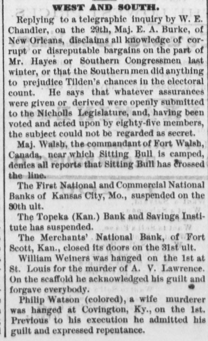 WEST AND SOUTH. Replying to a telegraphic inquiry by W. E. Chandler, on the 29th, Maj. E. A. Burke, of New Orleans, disclaims all knowledge of corrupt or disreputable bargains on the part of Mr. Hayes or Southern Congressmen last winter, or that the Southern men did anything to prejudice Tilden's chances in the electoral count. He says that whatever assurances were given or derived were openly submitted to the Nicholls Legislature, and, having been voted and acted upon by eighty-five members, the subject could not be regarded as secret. Maj. Walsh, the commandant of Fort Walsh, Canada, near which Sitting Bull is camped, denies all reports that Sitting Bull has crossed the line. The First National and Commercial National Banks of Kansas City, Mo., suspended on the 30th ult. The Topeka (Kan.) Bank and Savings Institute has suspended. The Merchants' National Bank, of Fort Scott, Kan., closed its doors on the 31st ult. William Weiners was hanged on the 1st at St. Louis for the murder of A. V. Lawrence. On the scaffold he acknowledged his guilt and forgave everybody. Philip Watson (colored), a wife murderer was hanged at Covington, Ky., on the 1st. Previous to his execution he admitted his guilt and expressed repentance.