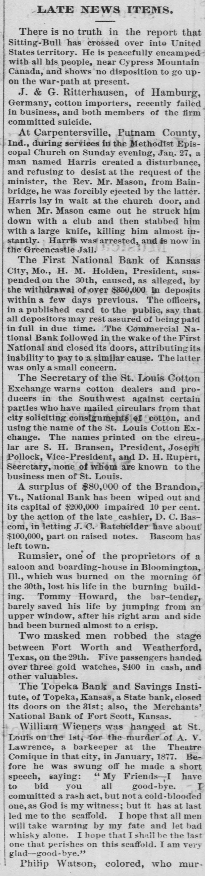LATE NEWS ITEMS. There is no truth in the report that Sitting-Bull has crossed over into United States territory. He is peacefully encamped with all his people, near Cypress Mountain Canada, and shows no disposition to go upon the war-path at present. J. & G. Ritterhausen, of Hamburg, Germany, cotton importers, recently failed in business, and both members of the firm committed suicide. At Carpentersville, Putnam County, Ind., during services in the Methodist Episcopal Church on Sunday evening, Jan. 27, a man named Harris created a disturbance, and refusing to desist at the request of the minister, the Rev. Mr. Mason, from Bainbridge, he was forcibly ejected by the latter. Harris lay in wait at the church door, and when Mr. Mason came out he struck him down with a club and then stabbed him with a large knife, killing him almost instantly. Harris was arrested, and is now in the Greencastle Jail. The First National Bank of Kansas City, Mo., H. M. Holden, President, suspended on the 30th, caused, as alleged, by the withdrawal of over $350,000 in deposits within a few days previous. The officers, in a published card to the public, say that all depositors may rest assured of being paid in full in due time. The Commercial National Bank followed in the wake of the First National and closed its doors, attributing its inability to pay to a similar cause. The latter was only a small concern. The Secretary of the St. Louis Cotton Exchange warns cotton dealers and producers in the Southwest against certain parties who have mailed circulars from that city soliciting consignments of cotton, and using the name of the St. Louis Cotton Exchange. The names printed on the circular are S. H. Bransen, President, Joseph Pollock, Vice-President, and D. H. Rupert, Secretary, none of whom are known to the business men of St. Louis. A surplus of $80,000 of the Brandon, Vt., National Bank has been wiped out and its capital of $200,000 impaired 10 per cent. by the action of the late cashier, D. C. Bascom, in letting J.C. Batchelder have about $100,000, part on raised notes. Bascom has left town. Rumsier, one of the proprietors of a saloon and boarding-house in Bloomington, III., which was burned on the morning of the 30th, lost his life in the burning building. Tommy Howard, the bar-tender, barely saved his life by jumping from an upper window, after his right arm and side had been burned almost to a crisp. Two masked men robbed the stage between Fort Worth and Weatherford, Texas, on the 29th. Five passengers handed over three gold watches, $400 in cash, and other valuables. The Topeka Bank and Savings Institute, of Topeka, Kansas, a State bank, closed its doors on the 31st; also, the Merchants' National Bank of Fort Scott, Kansas. William Wieners was hanged at St. Louis on the 1st, for the murder of A. V. Lawrence, a barkeeper at the Theatre Comique in that city, in January, 1877. Before he was swung off he made a short speech, saying: " My Friends-I have to bid you all good-bye. committed a rash act, but not a cold-blooded one, as God is my witness; but it has at last led me to the scaffold. I hope that all men will take warning by my fate and let bad whisky alone. I hope that I shall be the last one that perishes on this scaffold. I am very glad-good-bye." Philip Watson, colored, who mur-
