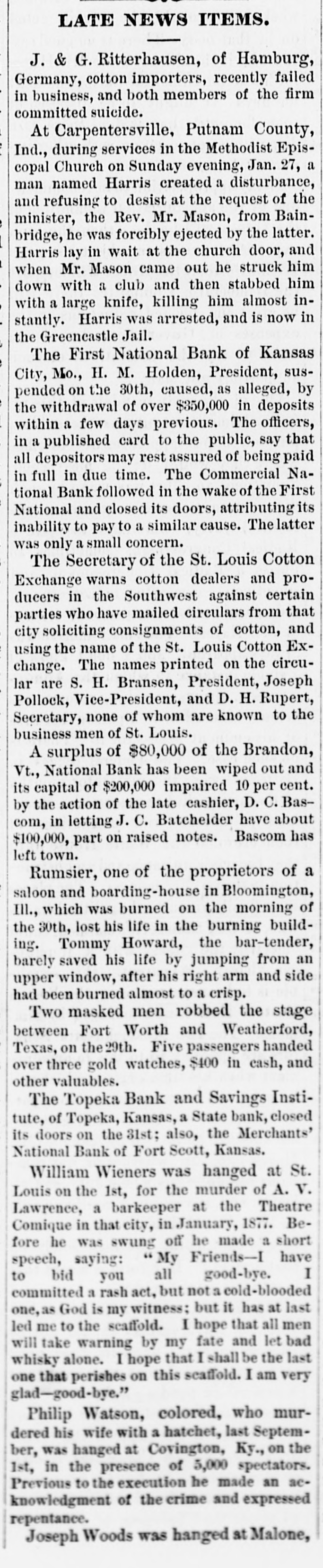 LATE NEWS ITEMS. J. & G. Ritterhausen, of Hamburg, Germany, cotton importers, recently failed in business, and both members of the firm committed suicide. At Carpentersville, Putnam County, Ind., during services in the Methodist Episcopal Church on Sunday evening, Jan. 27, a man named Harris created a disturbance, and refusing to desist at the request of the minister, the Rev. Mr. Mason, from Bainbridge, he was forcibly ejected by the latter. Harris lay in wait at the church door, and when Mr. Mason came out he struck him down with a club and then stabbed him with a large knife, killing him almost instantly. Harris was arrested, and is now in the Greencastle Jail. The First National Bank of Kansas City, Mo., H. M. Holden, President, suspended on the 30th, caused, as alleged, by the withdrawal of over $350,000 in deposits within a few days previous. The officers, in a published card to the public, say that all depositors may rest assured of being paid in full in due time. The Commercial National Bank followed in the wake of the First National and closed its doors, attributing its inability to pay to a similar cause. The latter was only a small concern. The Secretary of the St. Louis Cotton Exchange warns cotton dealers and producers in the Southwest against certain parties who have mailed circulars from that city soliciting consignments of cotton, and using the name of the St. Louis Cotton Exchange. The names printed on the circular are S. H. Bransen, President, Joseph Pollock, Vice-President, and D. H. Rupert, Secretary, none of whom are known to the business men of St. Louis. A surplus of $80,000 of the Brandon, Vt., National Bank has been wiped out and its capital of $200,000 impaired 10 per cent. by the action of the late cashier, D. C. Bascom, in letting J. C. Batchelder have about $100,000, part on raised notes. Bascom has left town. Rumsier, one of the proprietors of a saloon and boarding-house in Bloomington, Ill., which was burned on the morning of the 30th, lost his life in the burning building. Tommy Howard, the bar-tender, barely saved his life by jumping from an upper window, after his right arm and side had been burned almost to a crisp. Two masked men robbed the stage between Fort Worth and Weatherford, Texas, on the29th. Five passengers handed over three gold watches, $400 in cash, and other valuables. The Topeka Bank and Savings Institute, of Topeka, Kansas, a State bank, closed its doors on the 31st; also, the Merchants' National Bank of Fort Scott, Kansas. William Wieners was hanged at St. Louis on the 1st, for the murder of A. v. Lawrence, a barkeeper at the Theatre Comique in that city, in January, 1877. Before he was swung off he made a short speech, saying: " My Friends-I have I to bid you all good-bye. committed a rash act, but not a cold-blooded one, as God is my witness; but it has at last led me to the scaffold. I hope that all men will take warning by my fate and let bad whisky alone. I hope that I shall be the last one that perishes on this scaffold. I am very glad-good-bye." Philip Watson, colored, who murdered his wife with a hatchet, last September, was hanged at Covington, Ky., on the 1st, in the presence of 5,000 spectators. Previous to the execution he made an acknowledgment of the crime and expressed repentance. Joseph Woods was hanged at Malone,